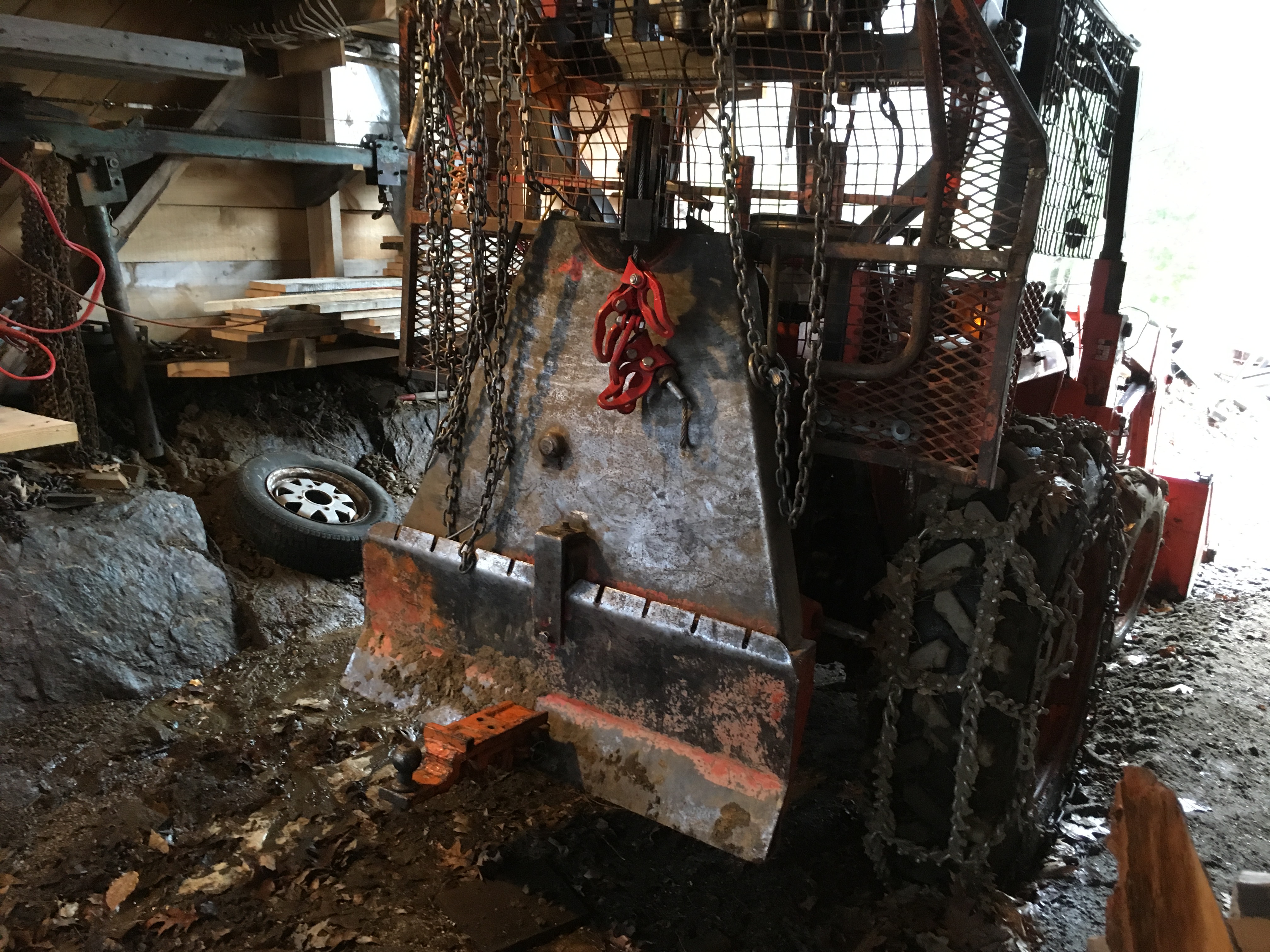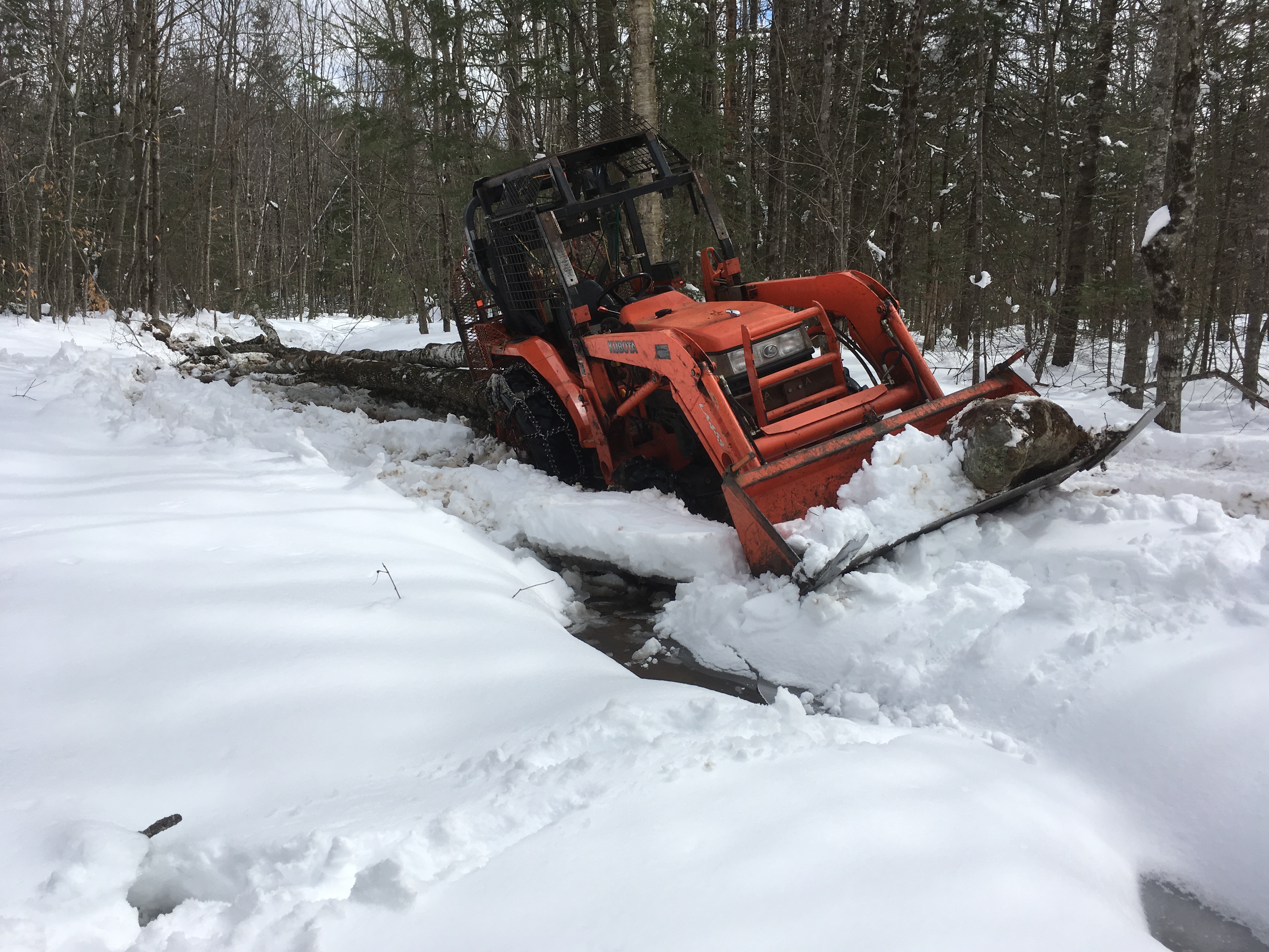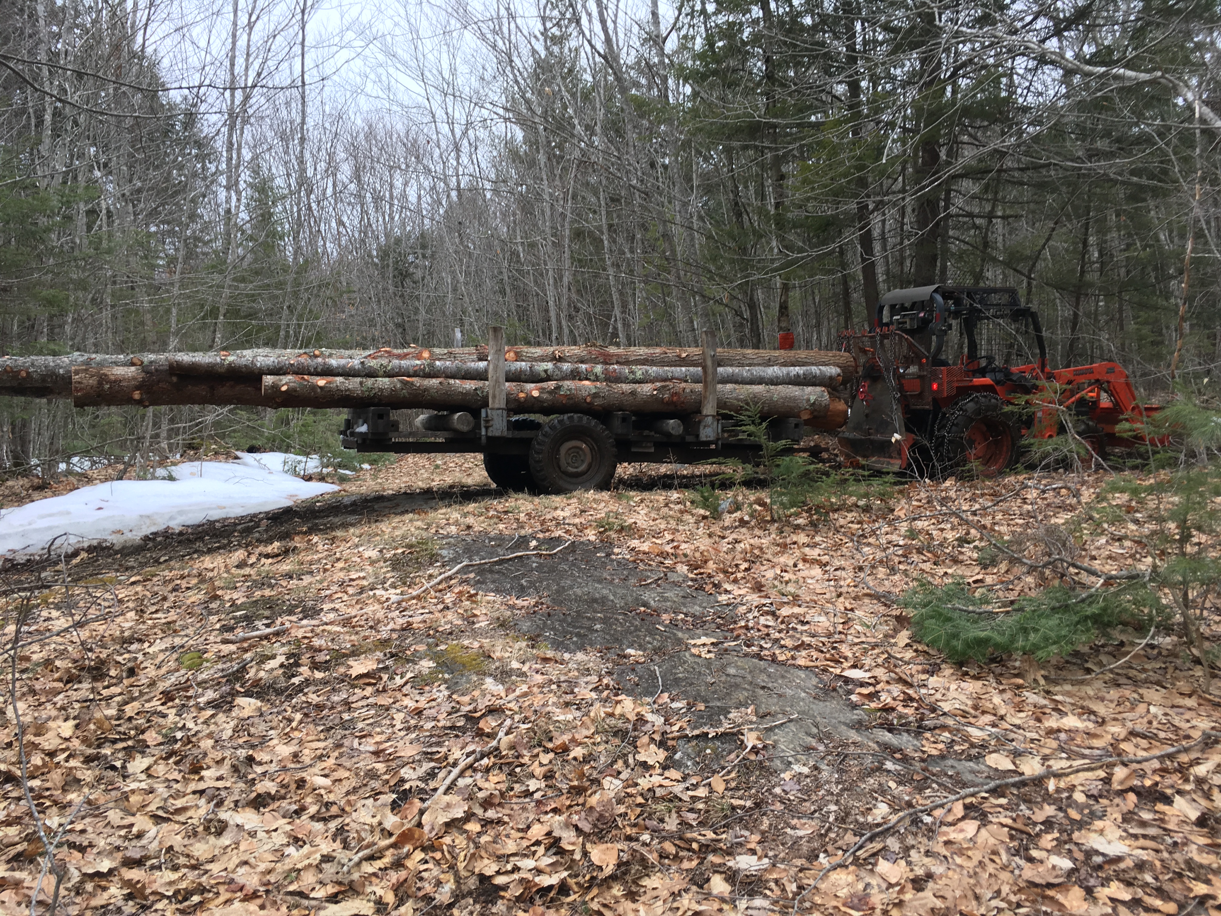 "Love your tongue weight adjuster or holder downer" :thumbsup:<<<<Yes isn't that some Yankee ingenuity, didn't think anyone would notice that, after I loaded the trailer, the tractor had a feeling of light on the rear, then as I was going threw a run-off brook heading out, almost out, the trailer came unhooked and the tongue was over 2' in the air, first time that's happened with three but cuts on front, but I started thinking since two of these trees was cut down last summer, one was blown over last Oct, with the tops not cut off, the tops must of sucked out most of water from the buts cause the tops still had some green on them.