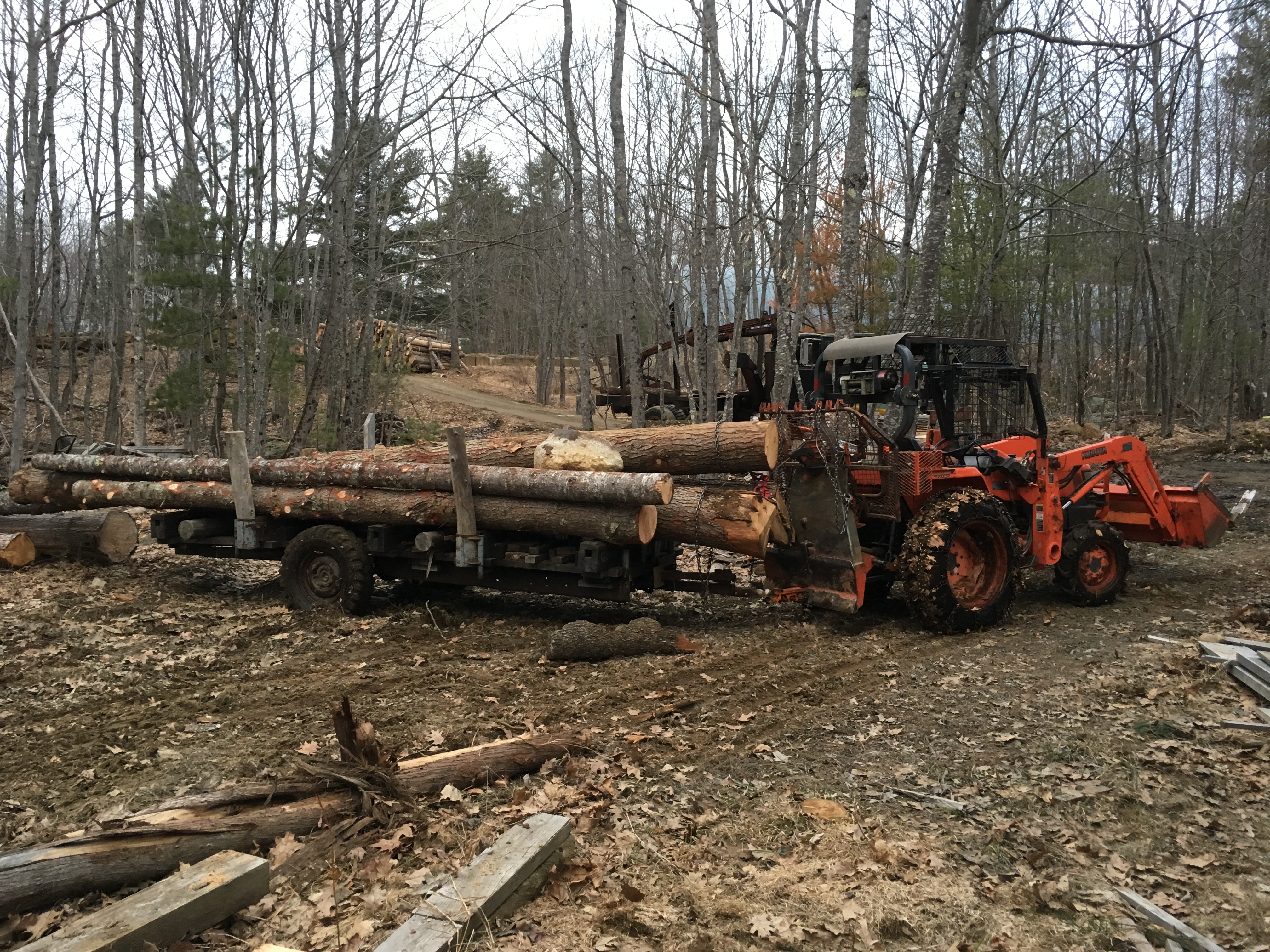When I load the 24' logs, it goes something like this, keep them low as possible, find the flattest ground I can and clear the least amount of trees that I can get away with. Sure another tractor would be better or trailer with loader, but either way a trailer will keep my logs cleaner and hauls a lot easier, instead of dragging one tree, with a trailer I can haul three>>>>