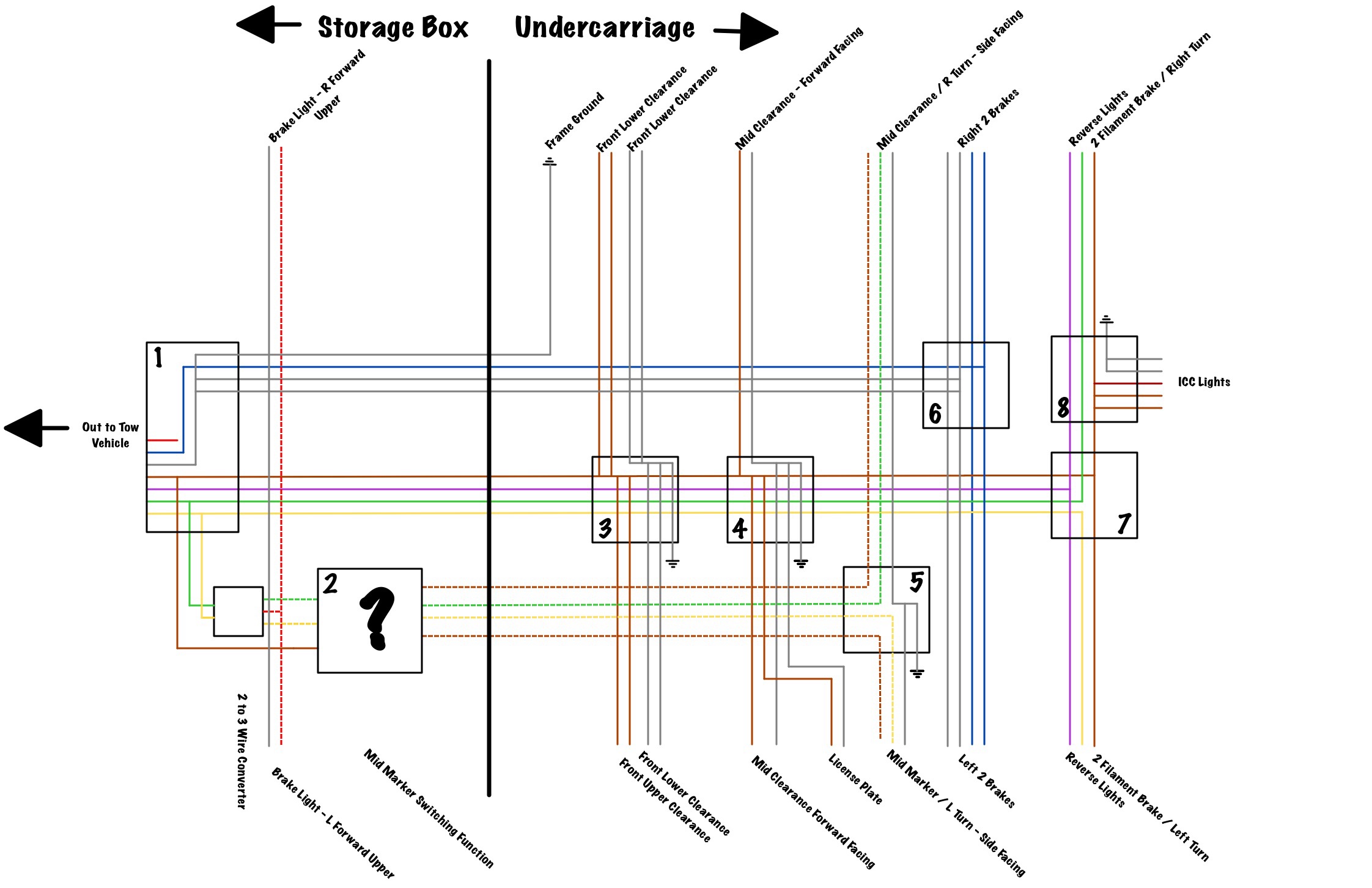 In any case one of things I did not like was the factory wiring job - scotch lock and wire wrapped around axle frames. One of the first things I have done is to start to re-work the wiring using junction boxes and heavier gauge SJOOW wire. I also have added LED rear ID lights, as well as side and front marker lights. Unfortunately I am getting in a bit over my head and could used some advice on a couple of points: