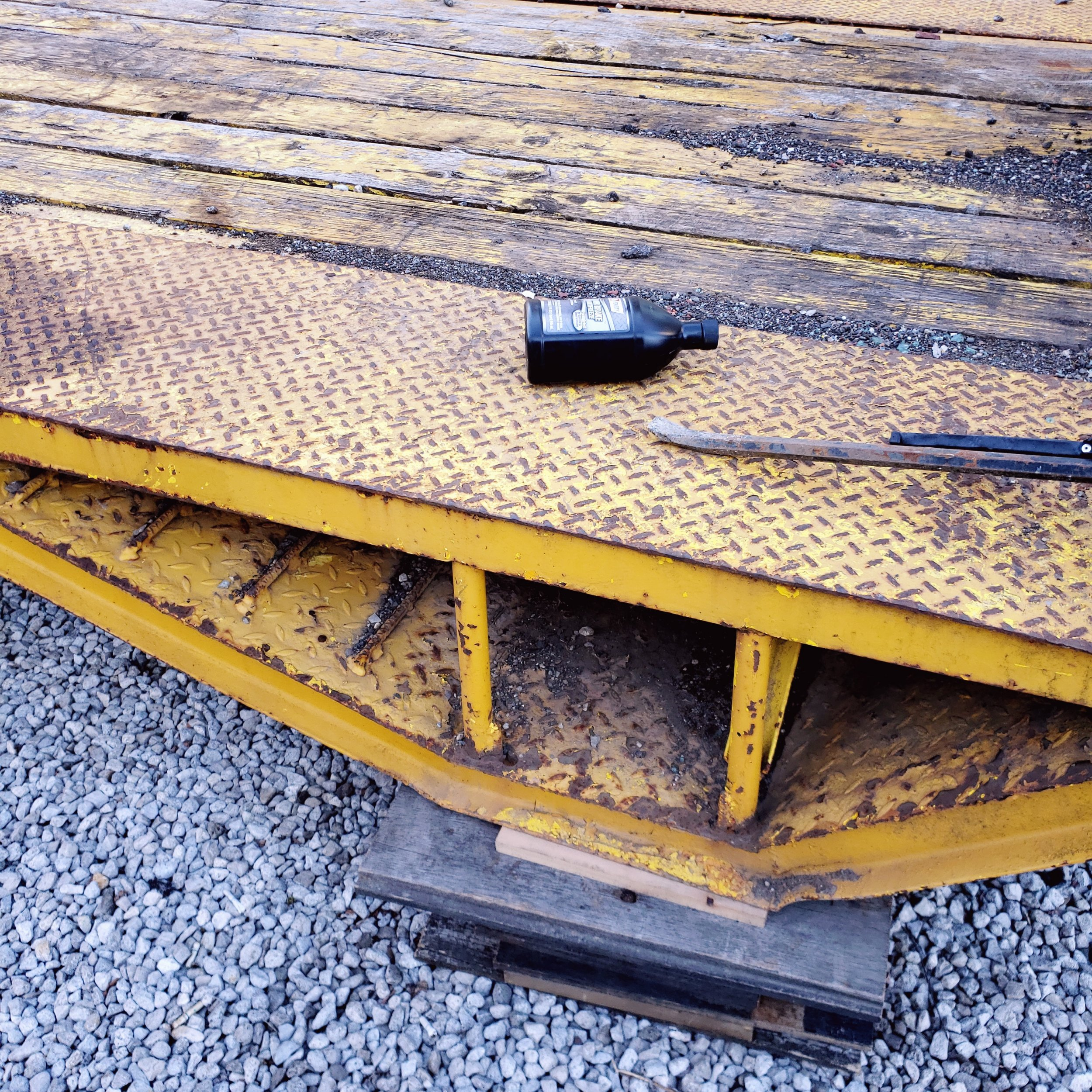 The dip is constructed of C-channel covered with diamond plate. Put a door on it and could store stuff there I guess. But the diamond plate has traction bars welded to it that would give traction to a wheel climbing out of the dip??? Stranger to me is the diamond plate parallel to the deck over the dip is made to be removable??