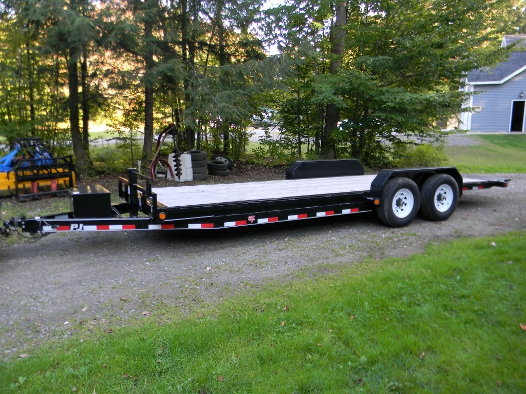 I have a PJ 14K tilt bed model TF 22' (actual just under 24' including tail). I added a winch and made D-rings that drop into the stake pockets. The axles are placed back further than most other brands so its not real long behind them. Weighs just under 4K. Tow with a Chevy 2500HD crew cab 4x4 6.0 gas 4.10 gearsView attachment 799148View attachment 799149View attachment 799152