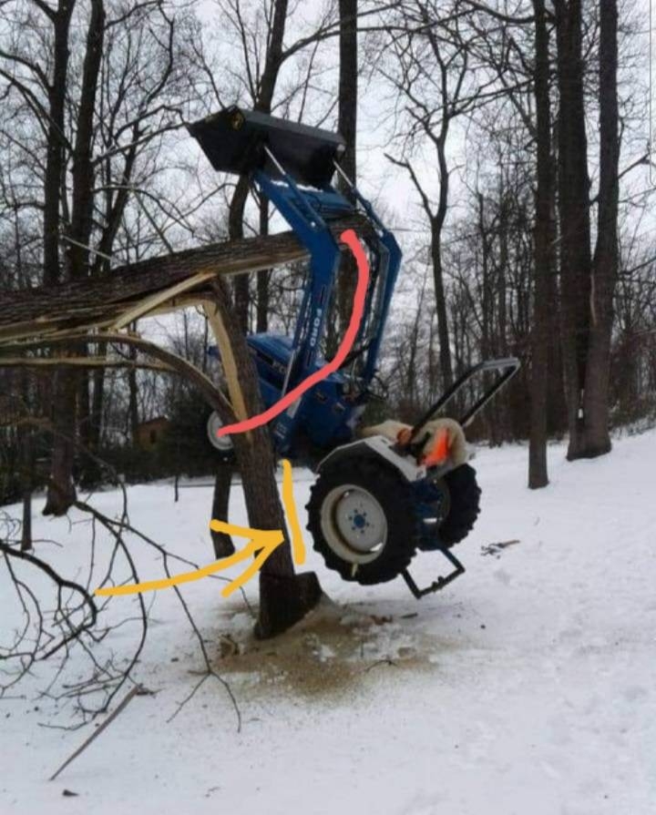 I think it's definitely possible, and likely, that it happened; looks to me that a really shallow narrow-angle face cut was made, then the back cut; the face closed without the tree going over, so the tractor pushed from farther around to the right where you can marks in the snow but the resolution sucks.