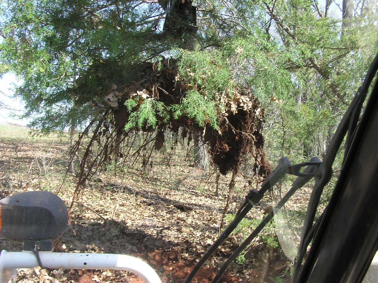 Pulling a multi-trunk cedar that is on the other side of the fence: