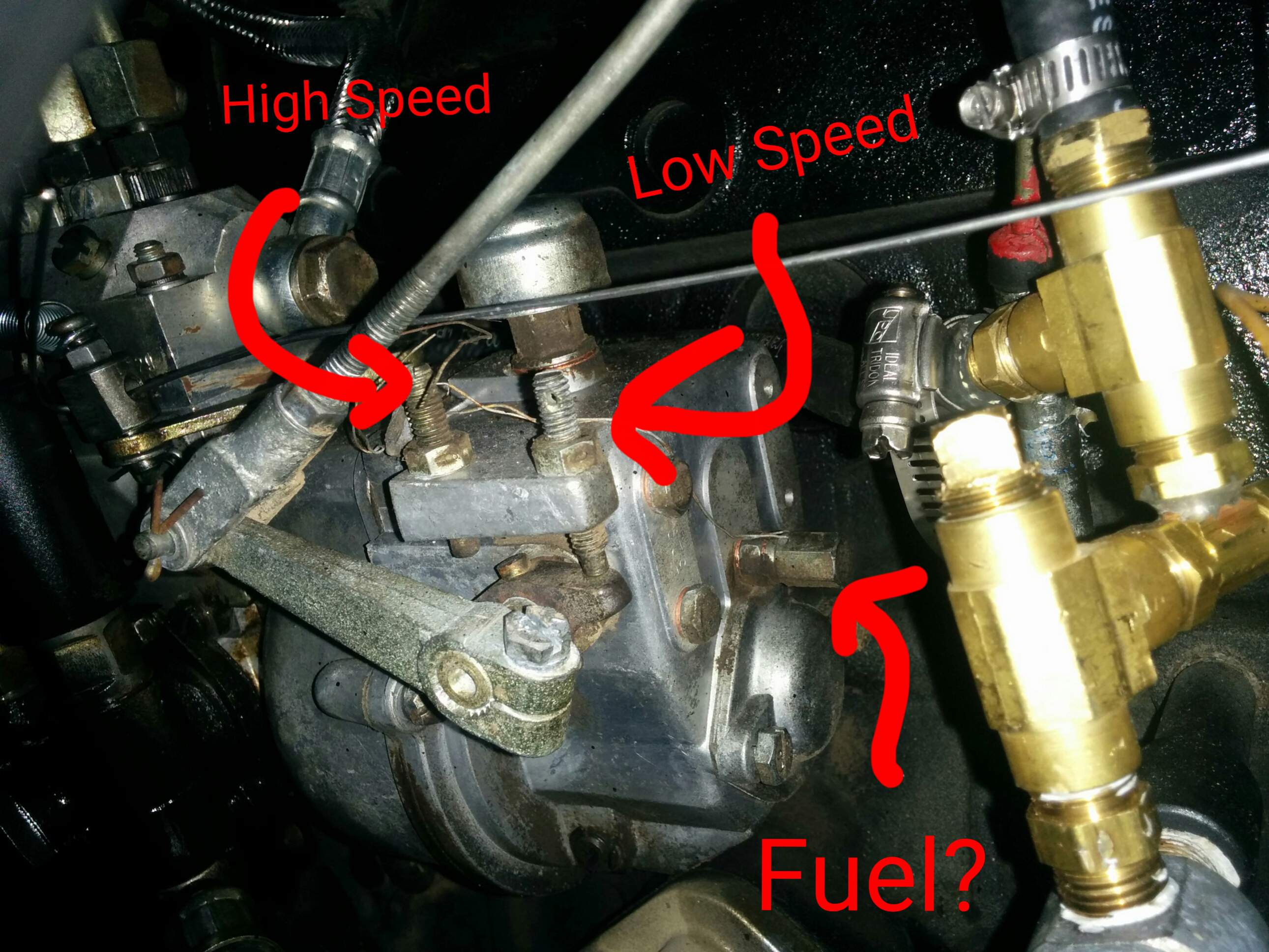 Here is a picture of the back of the injection pump. I have marked out on the picture the high and low speed adjustment for RPM and the third adjustment is on the back of the pump is fuel? The manual said there are three adjustments that are wired together so deductive reasoning would suggest that it is the max fuel screw on the back (it should increase the max travel of the rack).