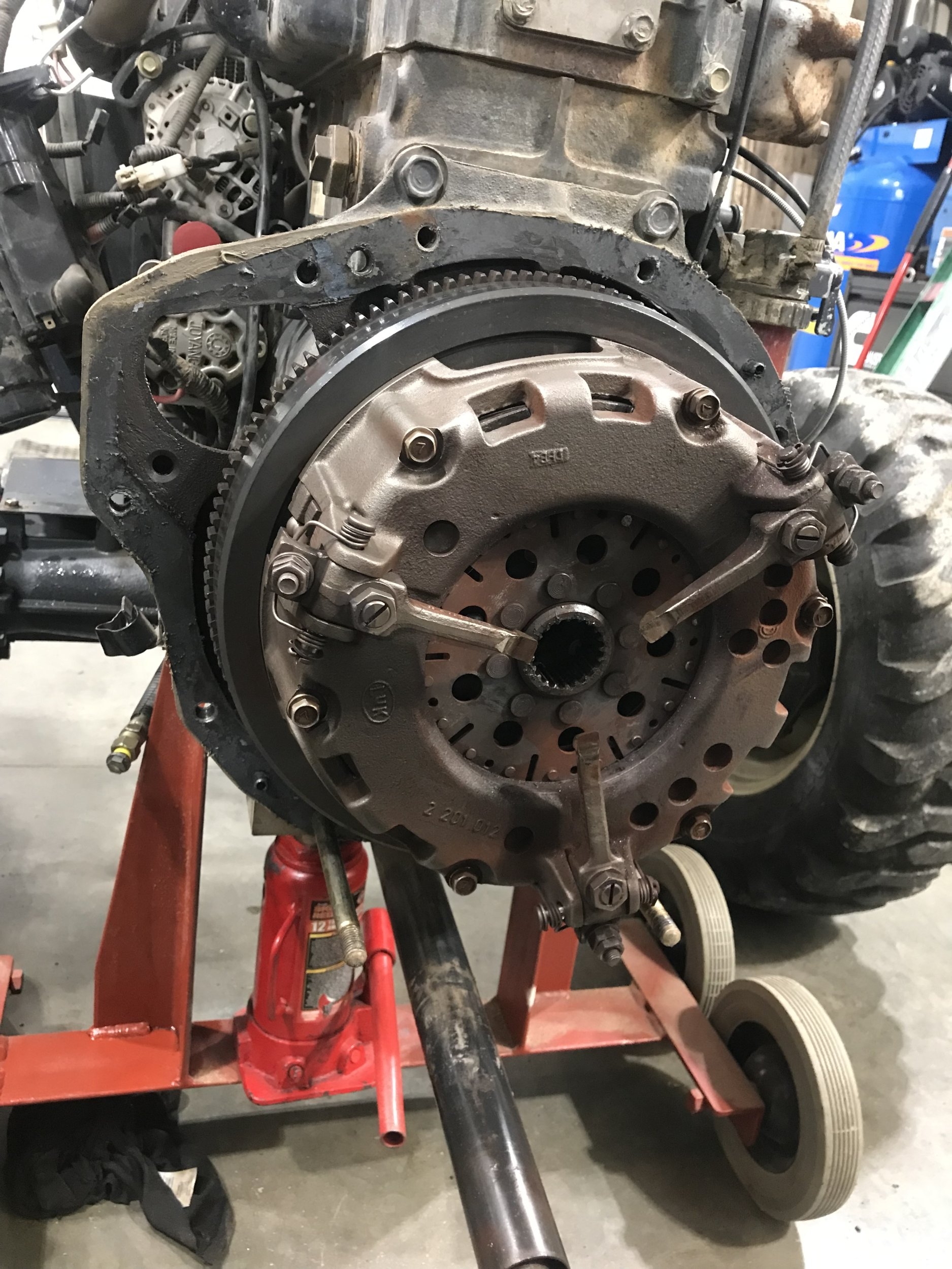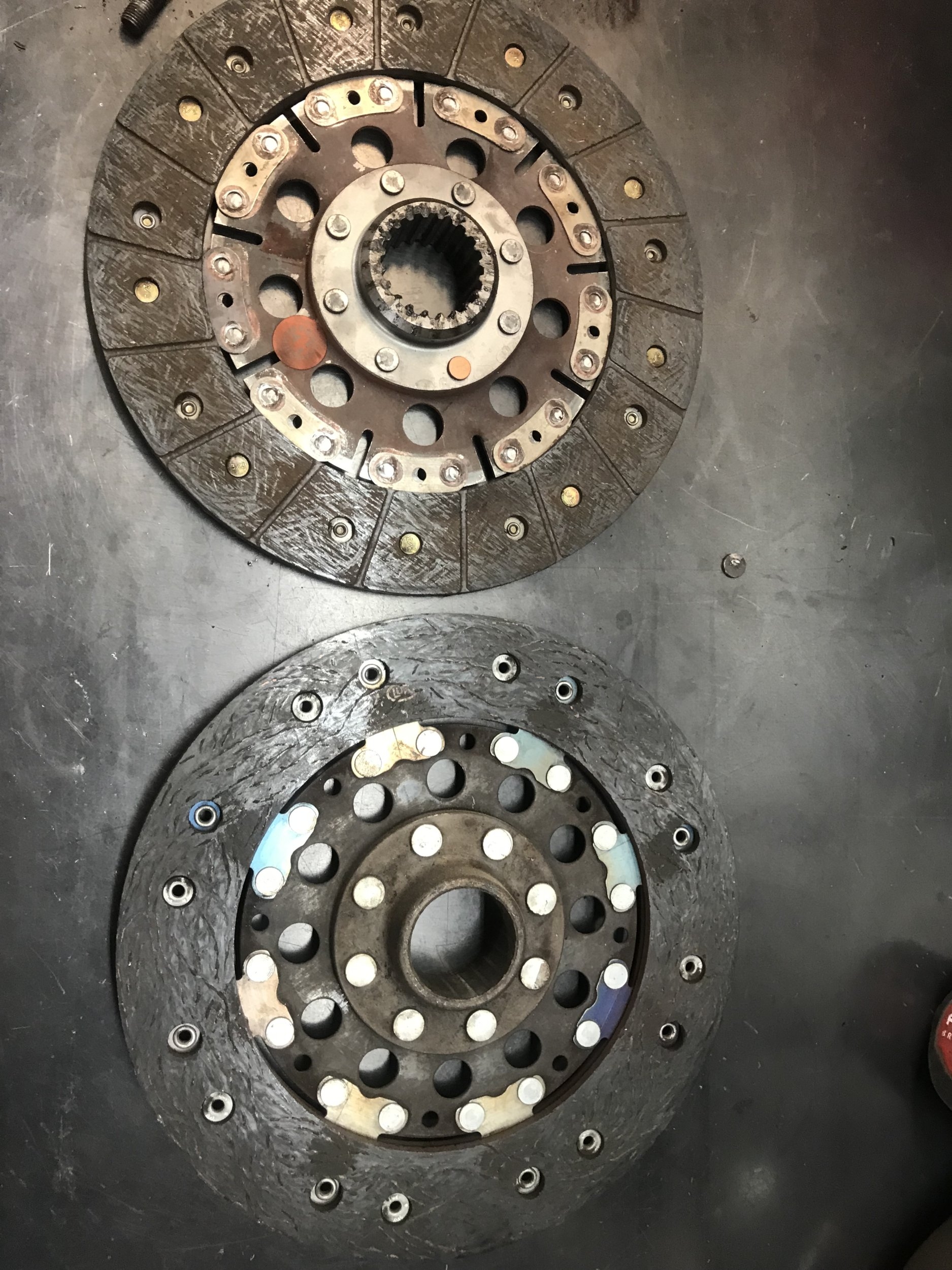 This tractor has 850hrs. on it, it has a two stage "belleville" style clutch. The PTO disc has very minimal wear (looks great), the main drive disc has "sheared" the spline teeth out of its center hub several times (true story). This last fail the clutch hub is fine but all the rivets sheard off clean!