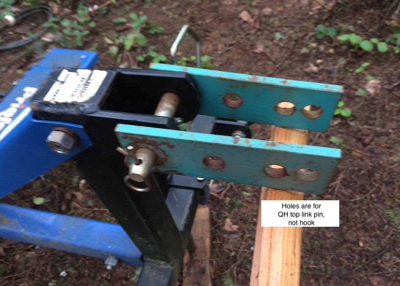 I bought that optional fork adapter to hitch my rotary mower, but I found a method simpler than using that: Since the mower has a rear wheel(s) you want it to track the ground contour rather than stay rigid relative to the tractor. The only time you need a top connector for the mower is when you want to lift the mower off the ground. I found throwing a loose loop of chain around the mower's top and the qhitch top is simpler to set up than using that fork. I also pull the hook pins (see photo above) and fold the hook up out of the way.