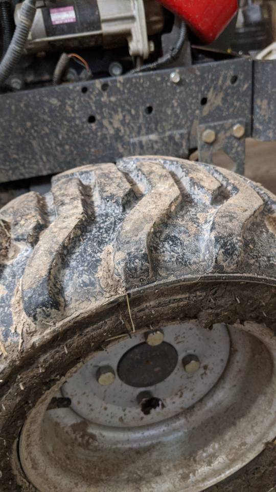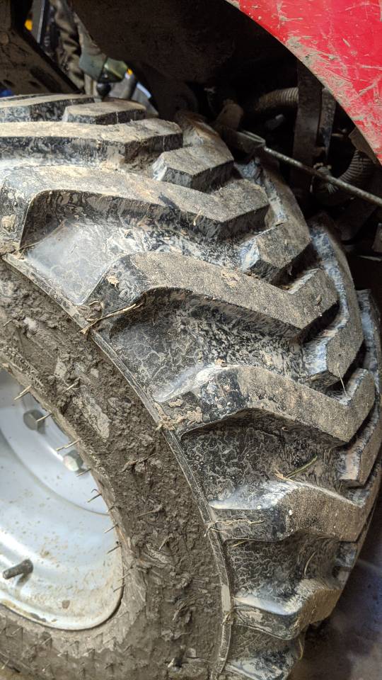 As for the front tires... They aren't like a car. Cars use double a arm which keeps wheel travel perpendicular to the ground where as a tractor has an axle with a center pivot. As it articulates the edges of the tires get warn. Also, steering pitches slightly when you turn on these machines and rounds the outer edges of the tires...again, perfectly normal stuff.