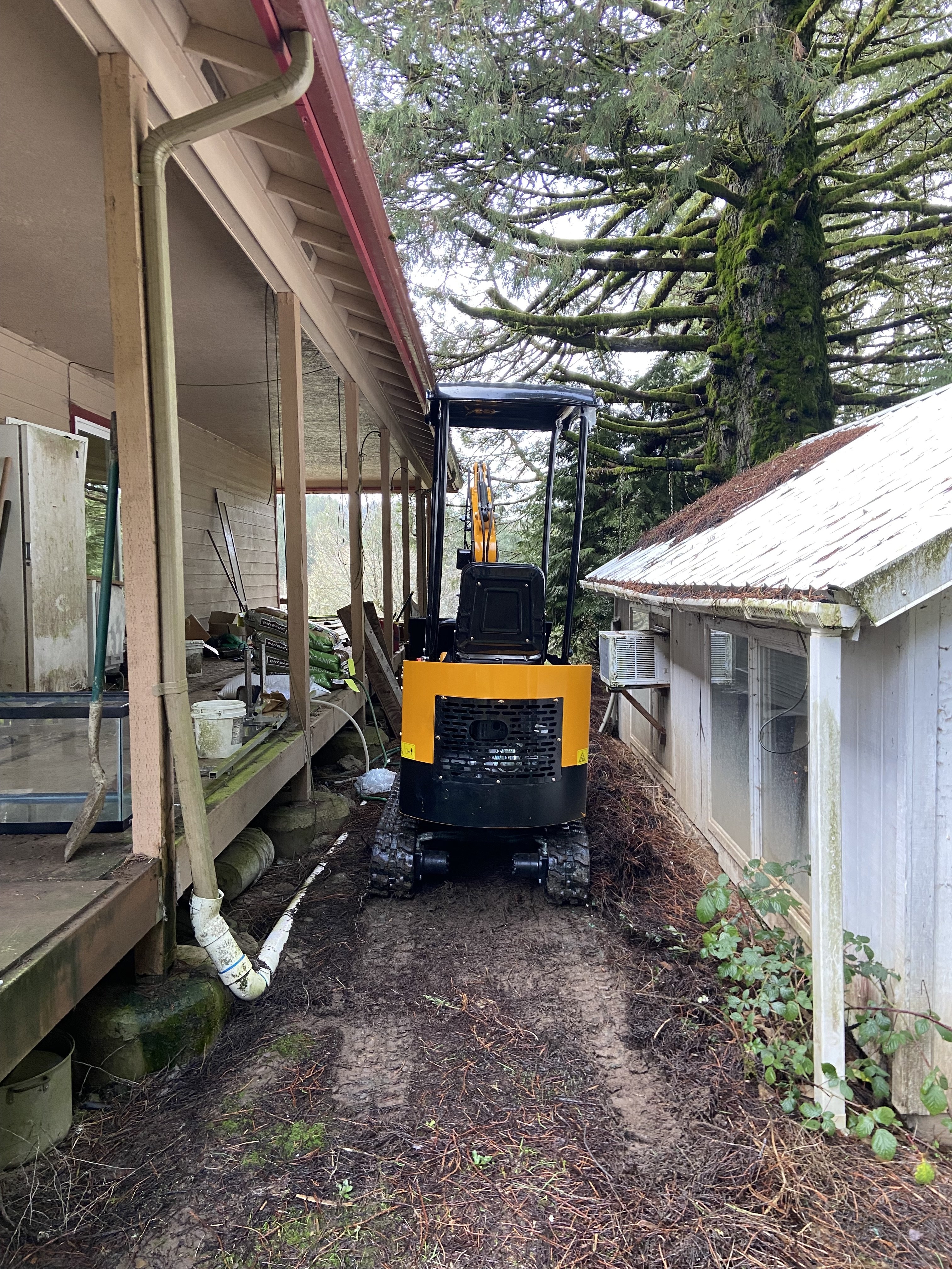 Performance wise, the machine ran great with the throttle set at 50%. Of course, raking up needles with the cleanup bucket wasn't exactly pushing its hydraulics to their limits, but the lower throttle setting did make it easier to get smooth motion out of the controls. It's definitely more jerky than my Sany SY35U, but that machine cost 10x as much as this one. At any rate, I can see why new operators would complain about jerkiness, but I proved to myself today that it's entirely usable for precision work if one is careful.