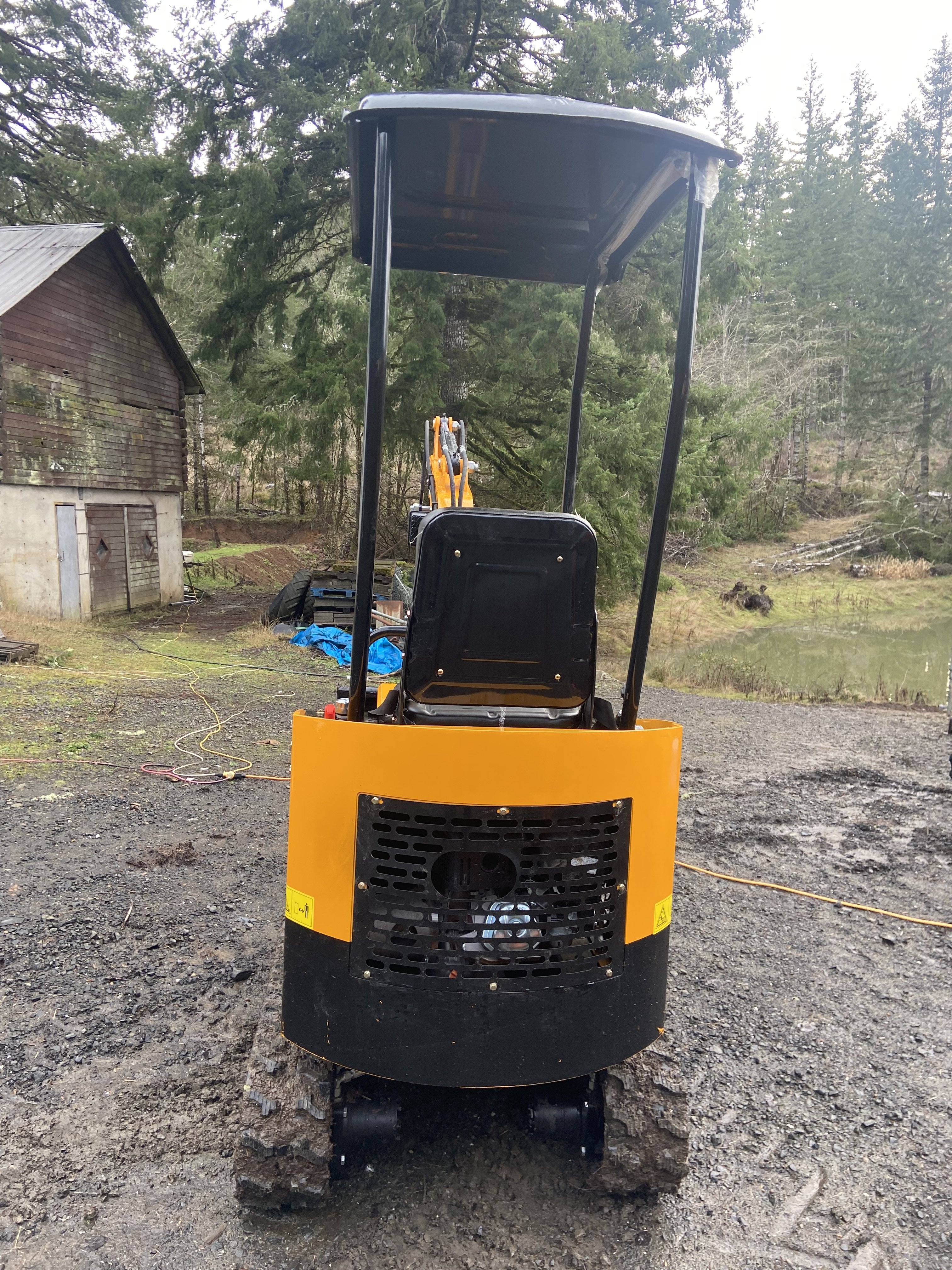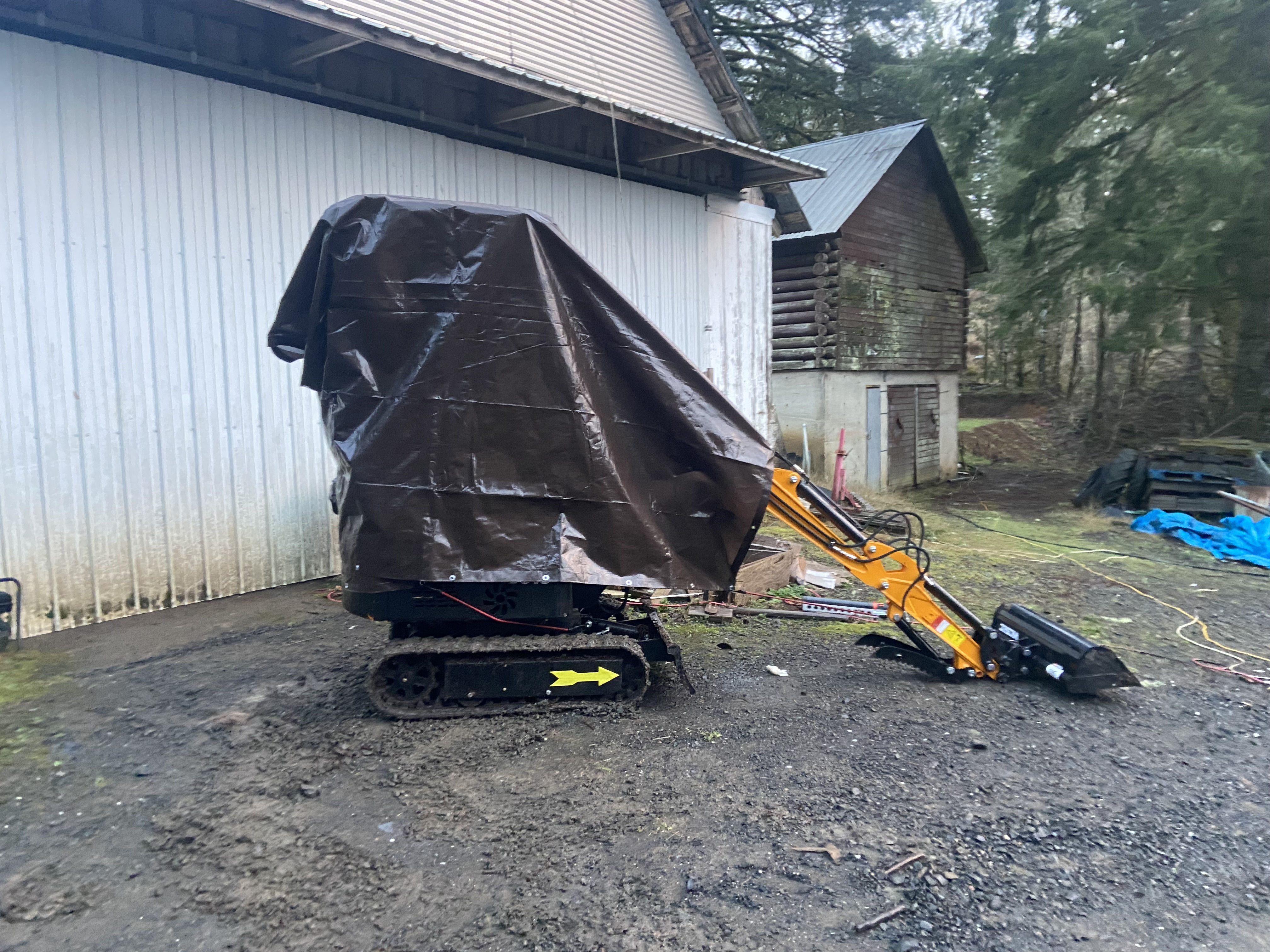 I managed to take a few photos of my machine today before/after installing its new hydraulic thumb. My Sany and Komatsu are in the background of the first. The last shows how I’m keeping it dry when not in use, until I can clear out some space in my garage (or I finish working on it and drive it down to the barn). The tarp works fine for now, but I will be much happier when it is parked under shelter.