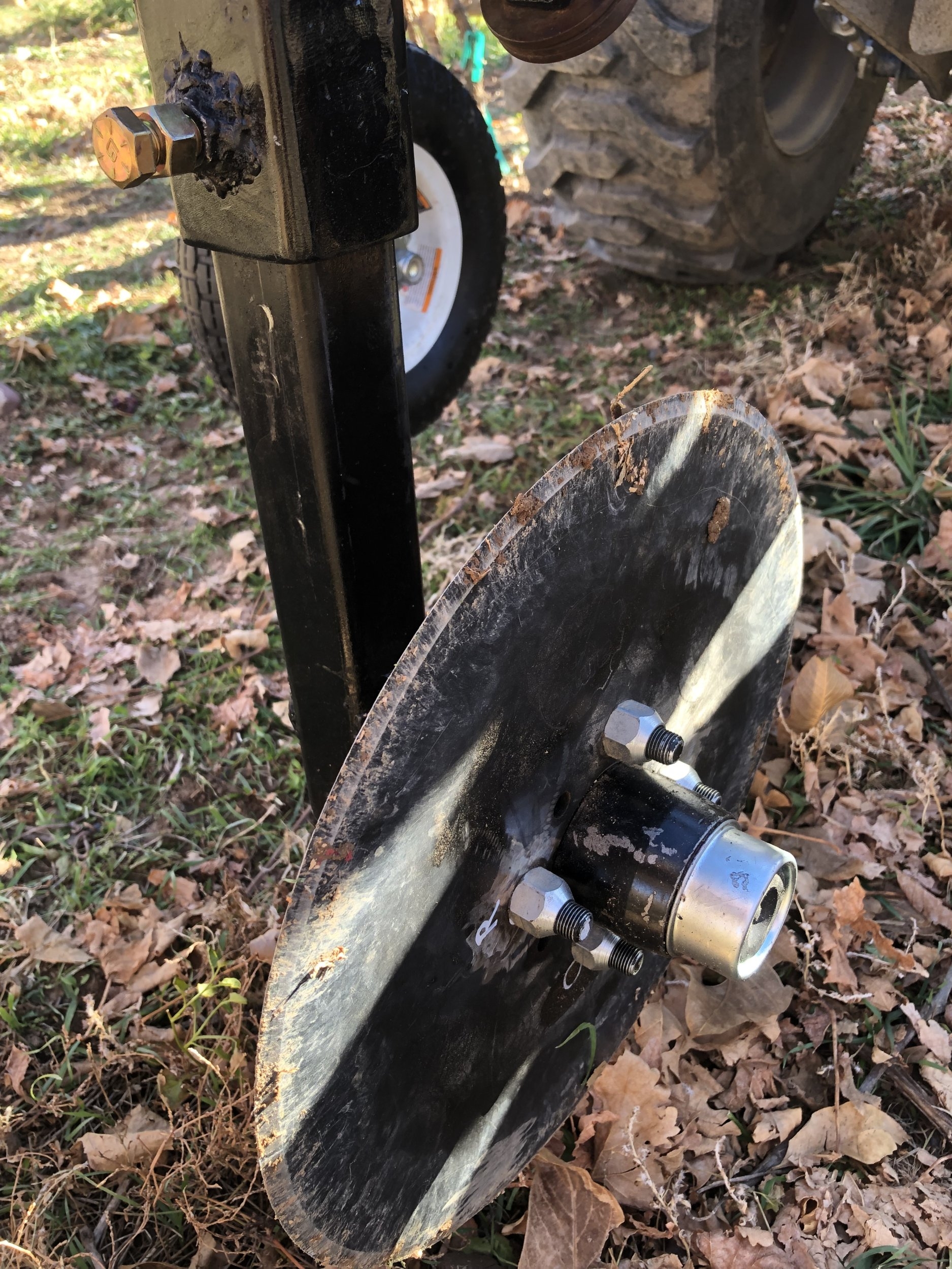 Coulter disc was a bit of a challenge. I couldnt find a cheap ag hub, so I bought a scratch and dent 4 on 4” bolt circle trailer off ebay. Coulter disc was also ebay, but bolt circle was metric and not even close. Drill a 4” bolt circle, I said! Hadnt thought of it, but discs are probably Rockwell 50. And then work harden as you drill them. Ended up spot annealing and drilling with a cobalt bit. Also not easy to lay out a 4” bolt circle on something with a big hub hole in the center. Ended up welding up the hole and redrilling. Not saying how many times