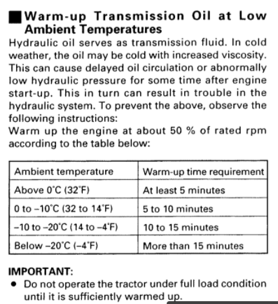 I always wait for the glow plug light to go out when the engine is cold. And I let it warm u for a few minutes while I gather tools, drinks, gloves, etal. I had also read somewhere (TBN prob) that engaging the rear PTO will warm up the hydraulic fluid faster so I do this in cold weather.