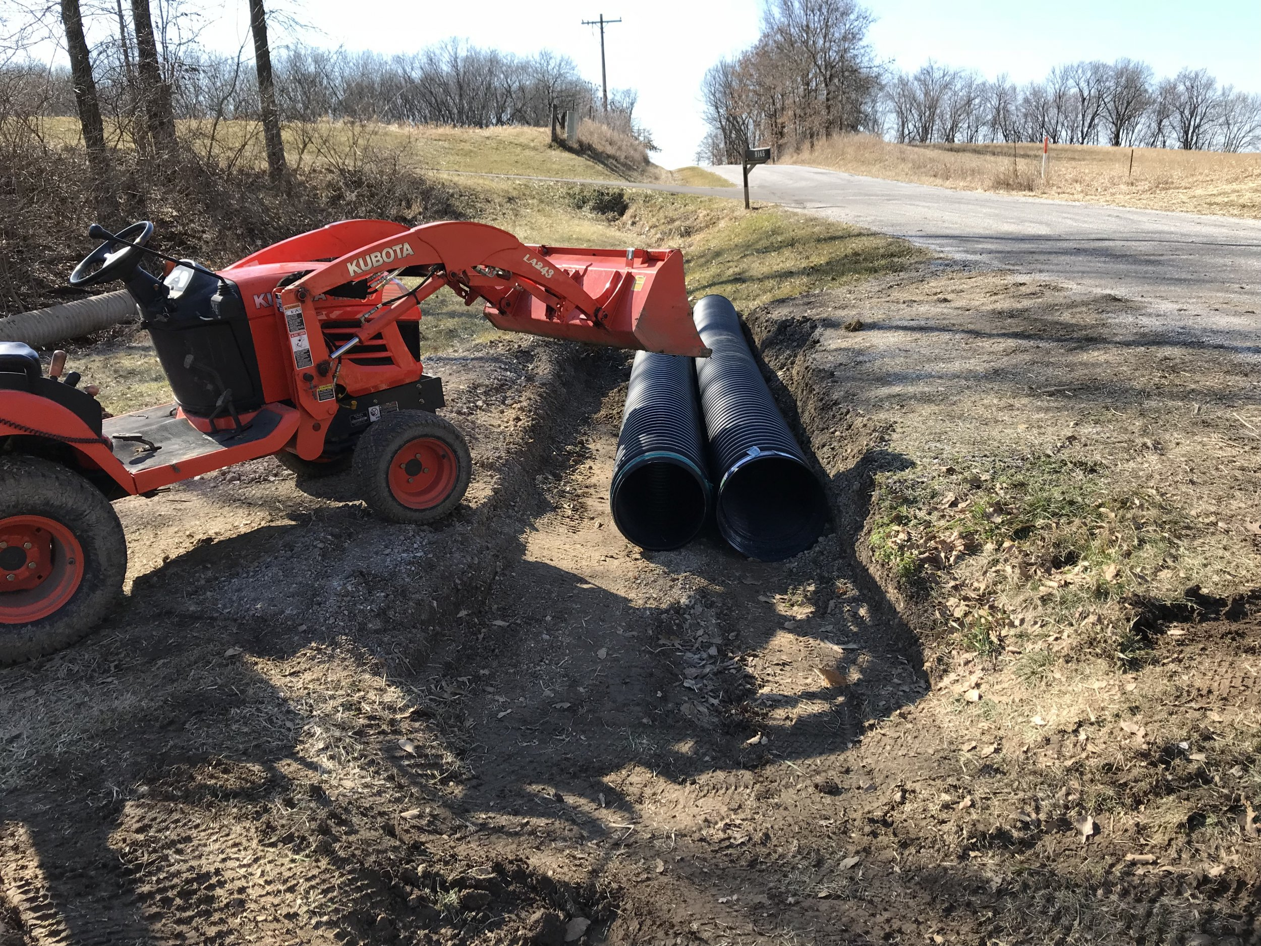 Ah, wide open space and unencumbered tractor operations in three dimensional space. You're living the dream!Sounds like you need bigger culverts or a second one. I have two driveways at my place. One paved and another gravel one that leads to a small storage building. The gravel drive had a single culvert that was to small and to short. People turned around in that drive and crushed the end. The water during a big rain would over top the culvert and run down the gravel drive and wash it out. I put in two new culverts instead of one and made them 10 feet longer.