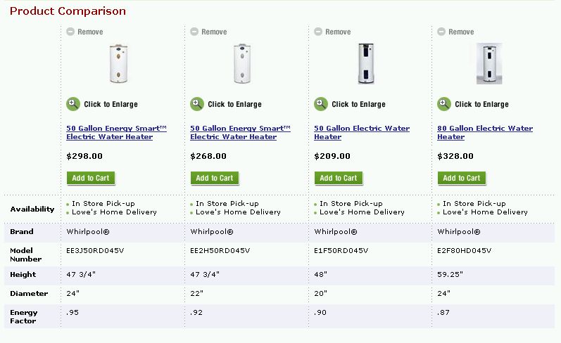 I've been looking at replacing my water heater and I like the models and prices at Lowe's. I attached a sample of their 50 gallon units as well as an 80. The main differences in the more expensive units are: <ul type="square"> [*]Longer warranty [*]More insulation [*]Better components (e.g. stainless steel vs. copper heating elements) [*] Fancy control box (this actually may be a good feature for your application) [/list] The more expensive units are more efficient mainly because of more insulation. Note the energy factors range from .87 to .95, and the higher the factor, the larger the diameter due to more insulation. By the way, I'm not sure any multi-year warranties would apply in a commercial setting.