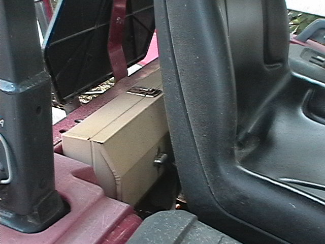 I have an old ammo box I'm planning to bolt to the right-side step on my 4110. I can't enter from that side anyway with the foot throttle and loader stick in the way.