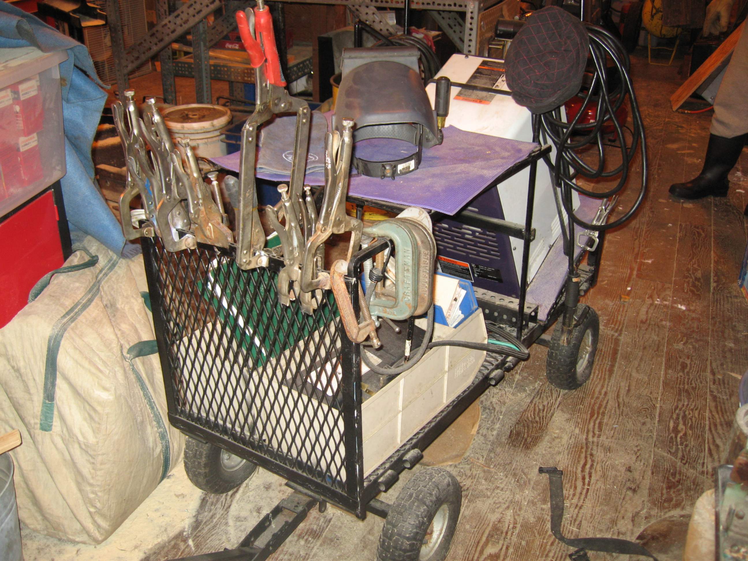 I weld in a barn, and have been planning to build an offroad cart. I have a platform where my shop is, so I can roll my current welding cart around fine, but if I want to move away from that, it's all gravel, and a pain. I am going to move up to a Thermal Arc 252i here in the near future, so I will build the cart to suit that. I plan on 8" aired tires, two in the back and skids on the front, and handles that will pull out and be used to push like a wheelbarrow, and push in/use to coil the gun and ground cables on otherwise. I want to be able to push this thing over gravel and semi-rough ground, because that's where some of my welding occurs. I like your idea of a wagon that you can pull, but I do want mine to be short, so it doesn't take up as much room in my shop.