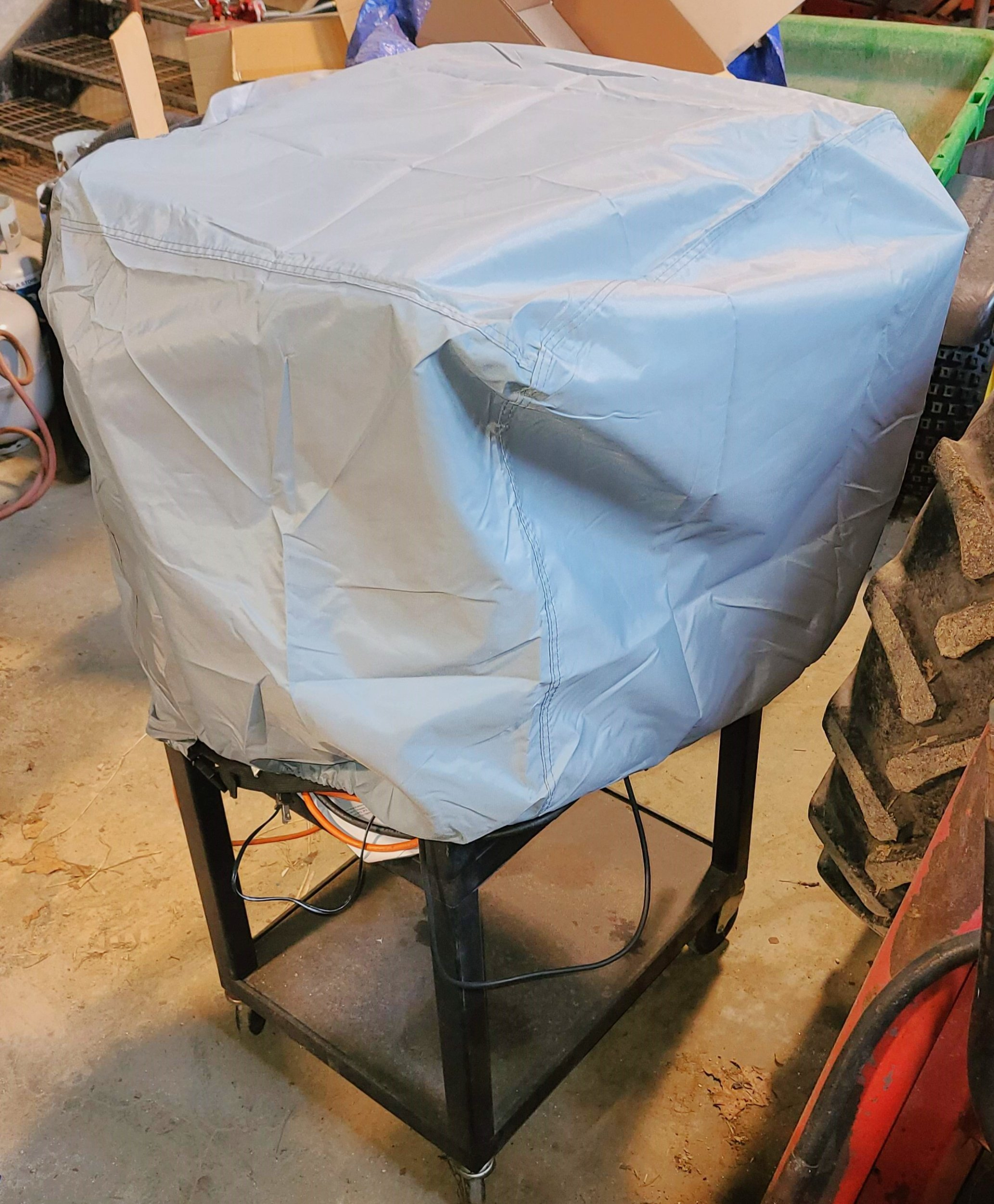 To move it in and out of my shop, I grab the 1” threaded rod on top (while wearing my welding gloves) and tilt it back on the big wheels. It rolls around good, even over steps and sort of large debris.