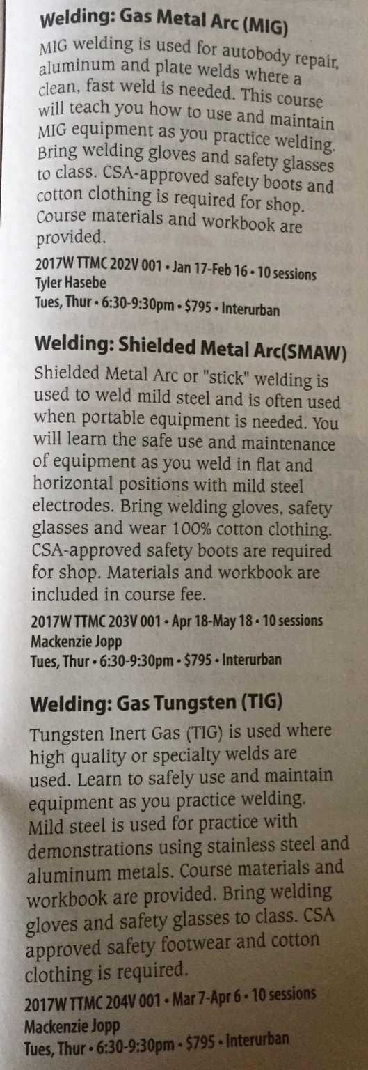 There is much mention of the value of taking beginner welding courses at Community Colleges. I've attached a photo/ad of what's available in MY area. $795 for 30 hours for any ONE of three processes.