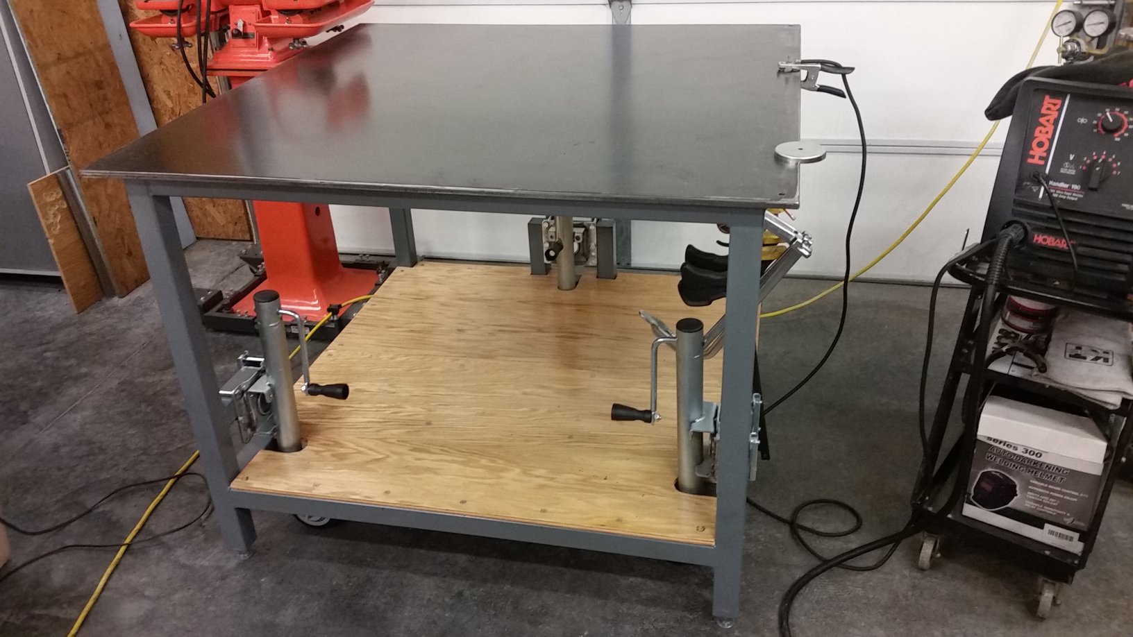 Project one is a welding table. Was going to make it 1/4" or 3/8" but the metal guy had some 1/2" that made my heart flutter. 48 x 48 built with 2 X 2 x 1/8 wall. It weighs over 450 lbs so I hit upon using HF trailer tongue jacks to raise it and move it. Front Legs are 2" shorter so I could make some levelers.