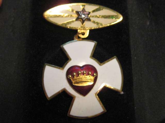 Well, usually I say that "I'm a doctor and I'm expected to know everything" ;), but I lucked out when Google returned the second medal with a search on: {medal with crown on red heart white cross}. Once I knew of the Odd Fellows relationship, I messed around a bit with varying combinations of {"Odd Fellows", dove, gold, olive, star, three, links}. Google used to be a lot better before they started prioritizing their advertisers and people learned how to "up" their link hits to bump their scores - but it still is the best search site IMHO.