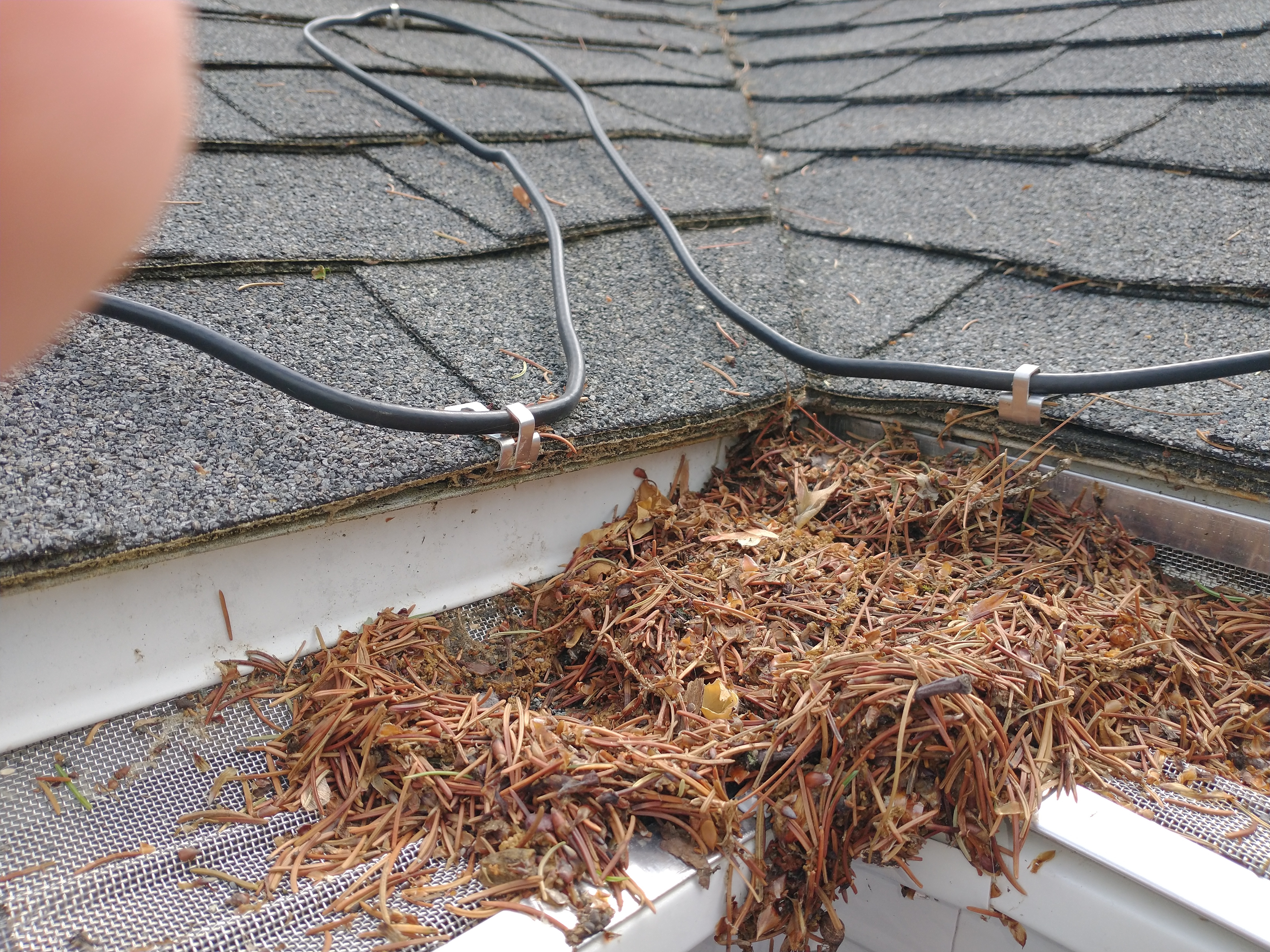 I end up going up with a shop vac and cleaning the pine needles frequently and have to run roof cables in the winter.