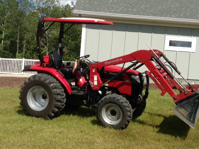 Just took a golf cart top and supports ($20), welded a gusset on each side, attached top to brackets, and attached to ROPS. Painted the top white to reflect the hot sun, and underside tractor red. Then mounted the top "backwards" so that the rain gutters flow out the front of the canopy, rather than the rear, and consequently, down my back.