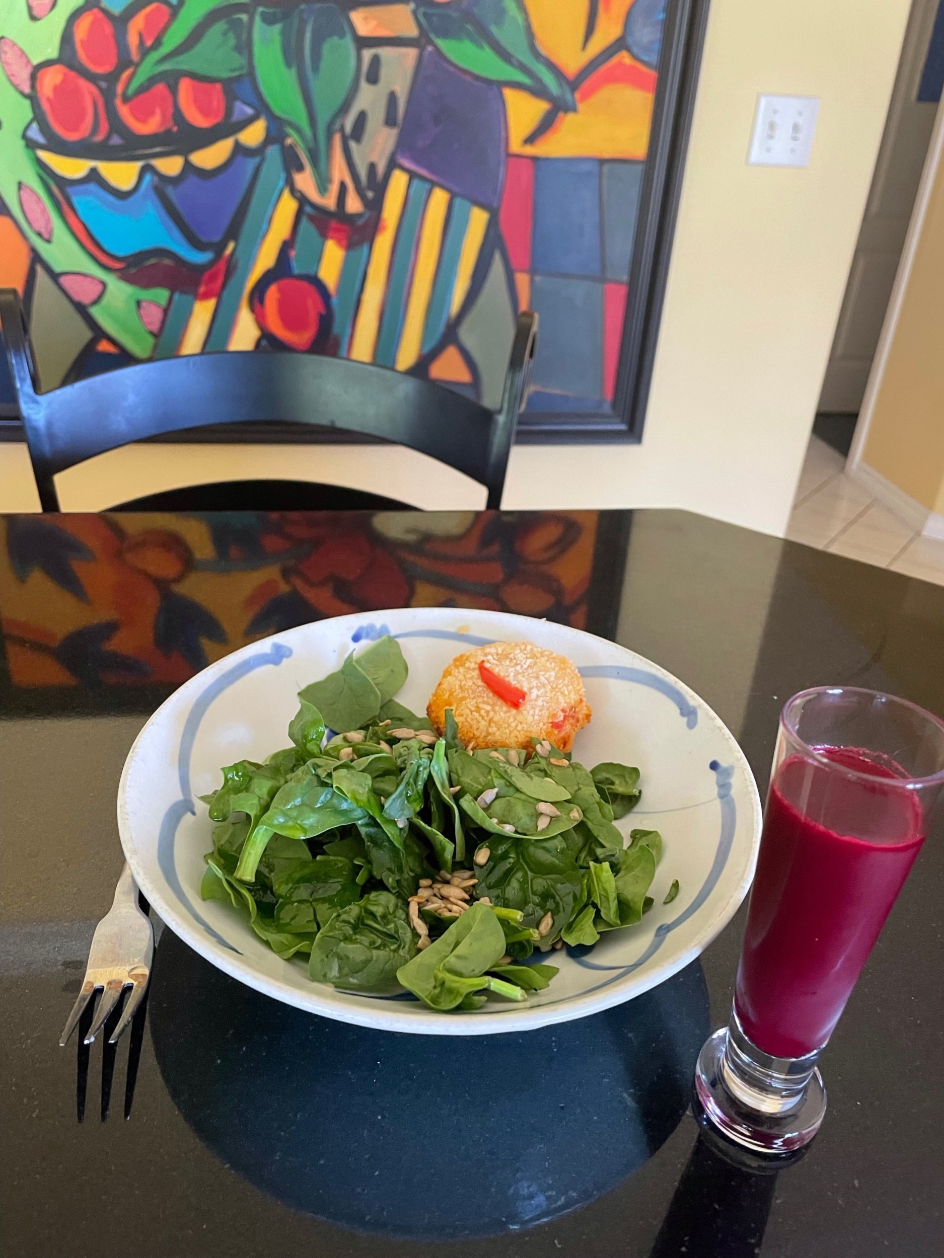 Washed down with a freshly juiced apple, carrot, beet , ginger root shooter.