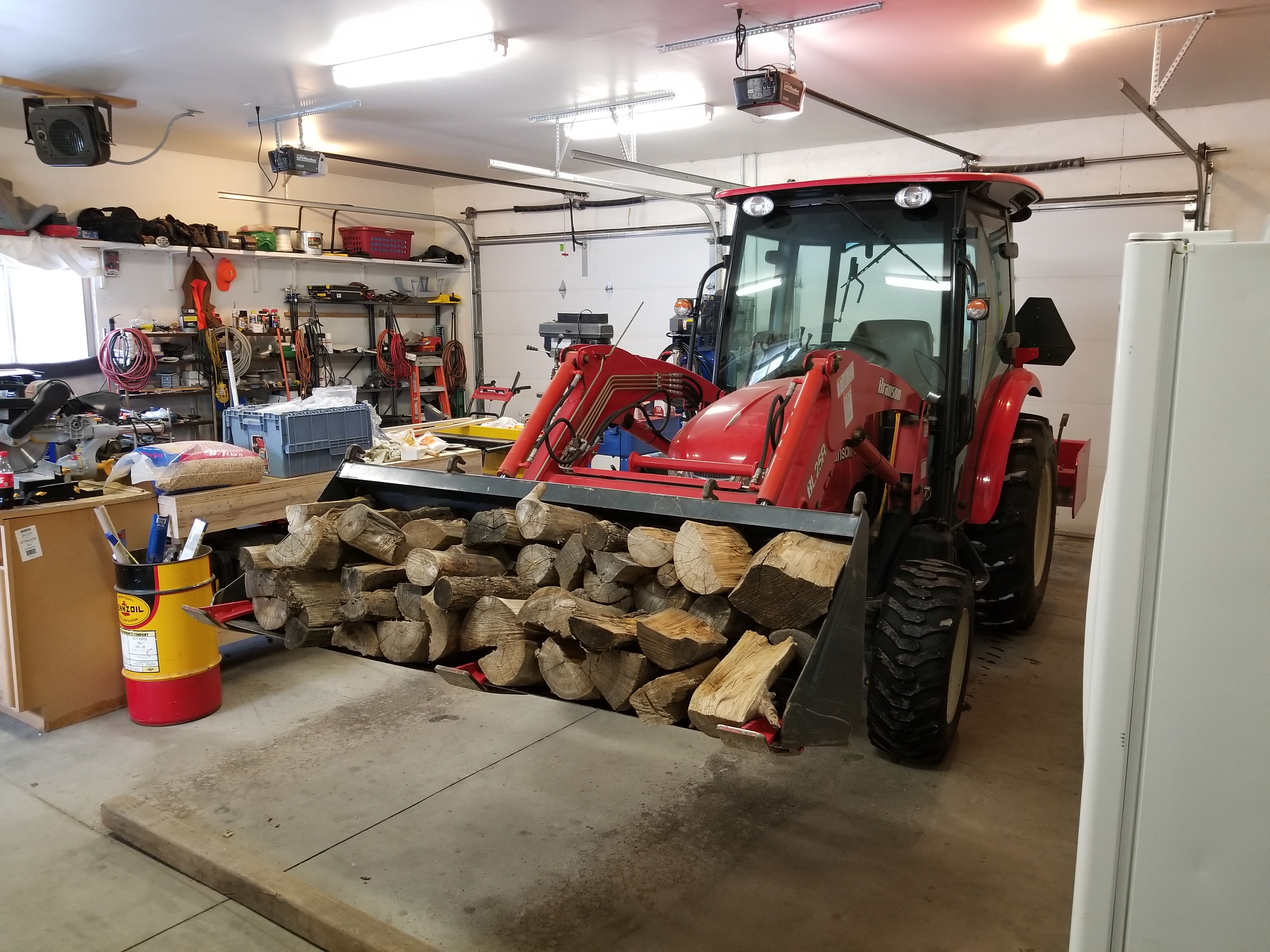 Nice to have a garage door tall enough I can drive the cabbed tractor all the way inside and close the door to stack off the wood.
