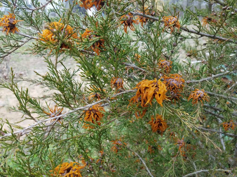 That looks very much like cedar rust. It is a problem for our orchard. We are surrounded by mixed evergreen and hardwoods and there are plenty of cedar and other trees to carry this fungus. It effects the juniper. Then the spore blow to an apple tree. And if untreated they run thru their cycle and blow back to the juniper forest.