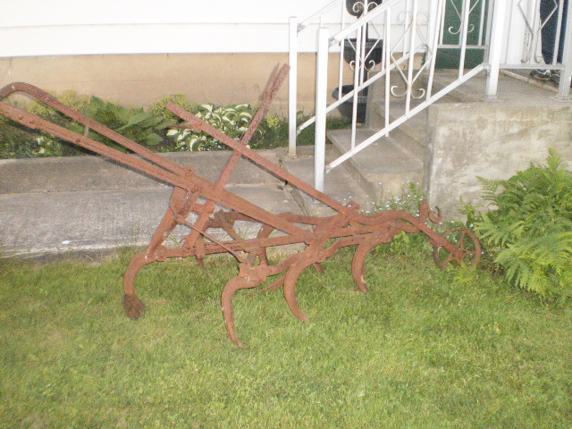 I think it's a horse drawn harrow/cultivator. If it works like the one I saw my grandfather using in his garden, the levers adjust both the depth of the shanks' ground penetration and the height of the wheel in front. The wheel when completly lowered would raise the height of the harrow for transport and when maximaly lowered would allow maximum shank penetration. The fact that the shanks are adjustable too allows for a wide range of cultivation depths for various applications and soil conditions.