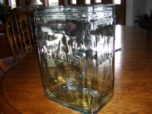 Glass jug, with "Gould" near center on all four sides. Near top, on all 4 sides it has "Water Level". It appears to be made for some kind of lid.