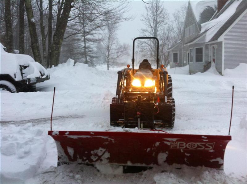 I'd suggest compromising and go with a 7.5 foot plow.  Our tractor/loaders are similar in size in weight, this what my 7.5 footer looks like from the front.  Granted it sticks out a little further then a loader designed plow because its made for a truck.  It pushed 2 feet of snow pretty well (Ag tires) but I can see why others would go with a seven footer.  Also, do you have a garage?  This plow just barely fits through my door without angling it, your garage door size may be a consideration.