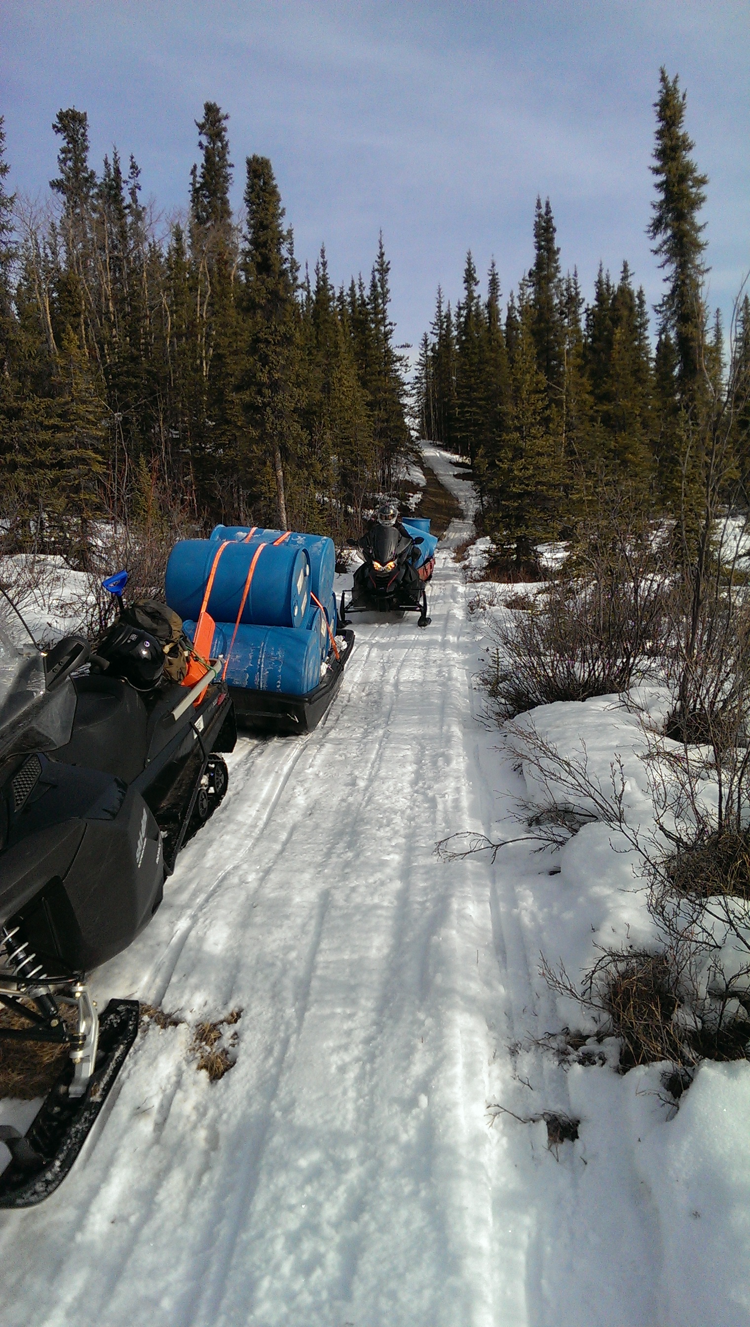 This is how we haul in materials in the winter. The snowmachine in back is hauling a canoe as well as some barrels. Barrels will be floats for the dock.