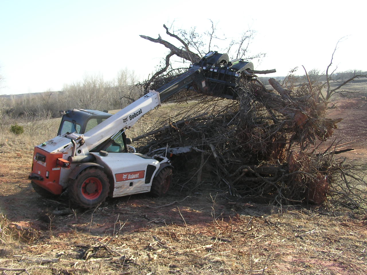 Moving an old brush pile with the Monster Grapple, that is too close to the trees to burn, to a new pile down the hill were it can be burned.