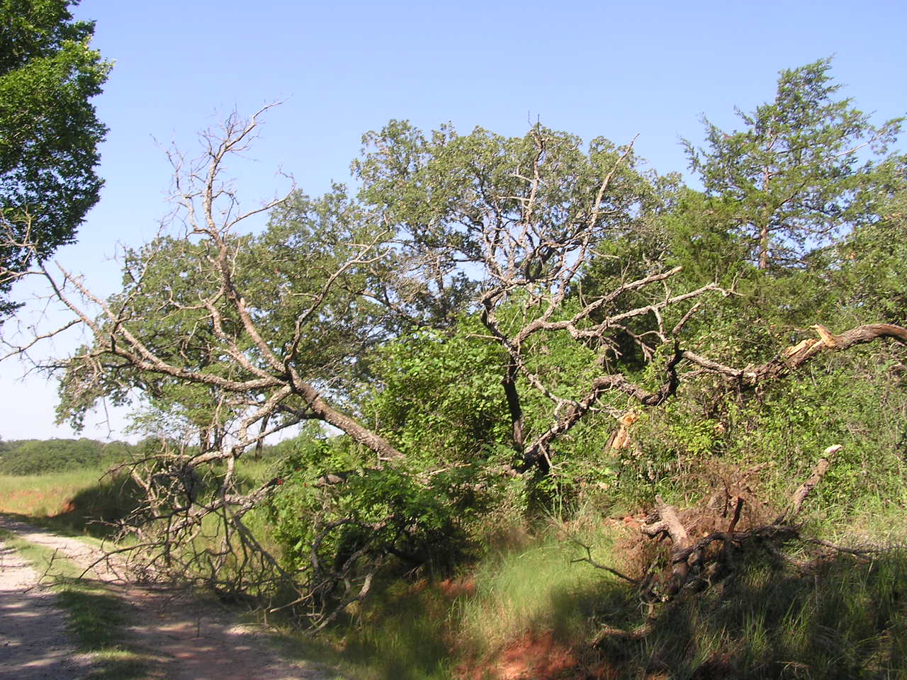 I use my JD110 TLB front bucket or even pallet forks to push trees over. Depending on the ground conditions and the age/size of the trees I may also use the backhoe to push them over.