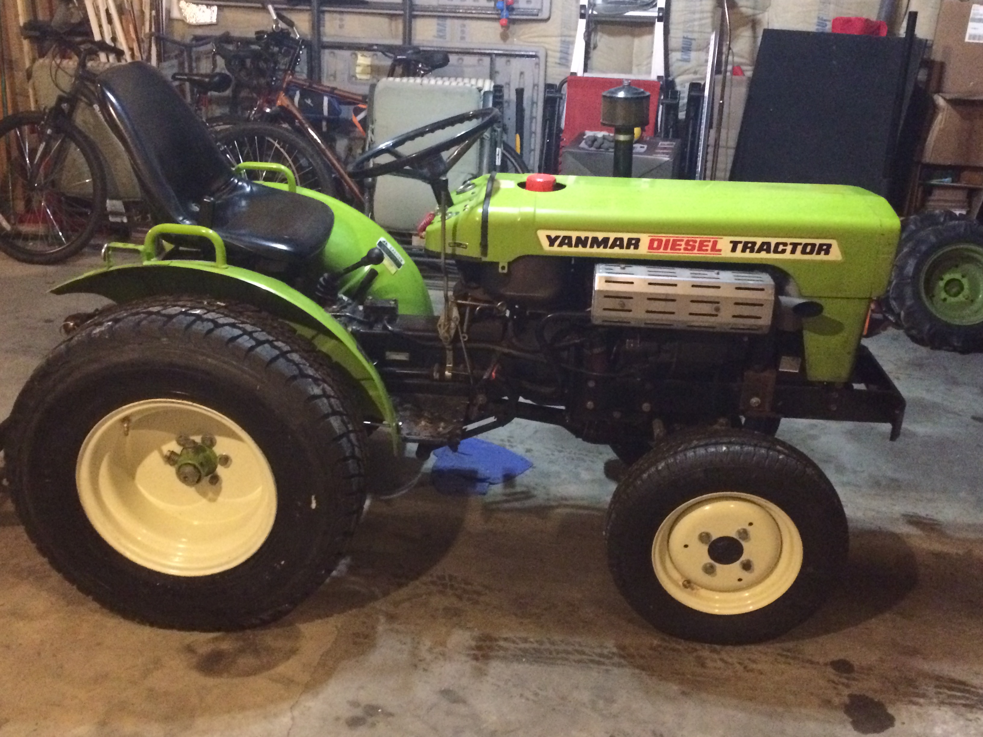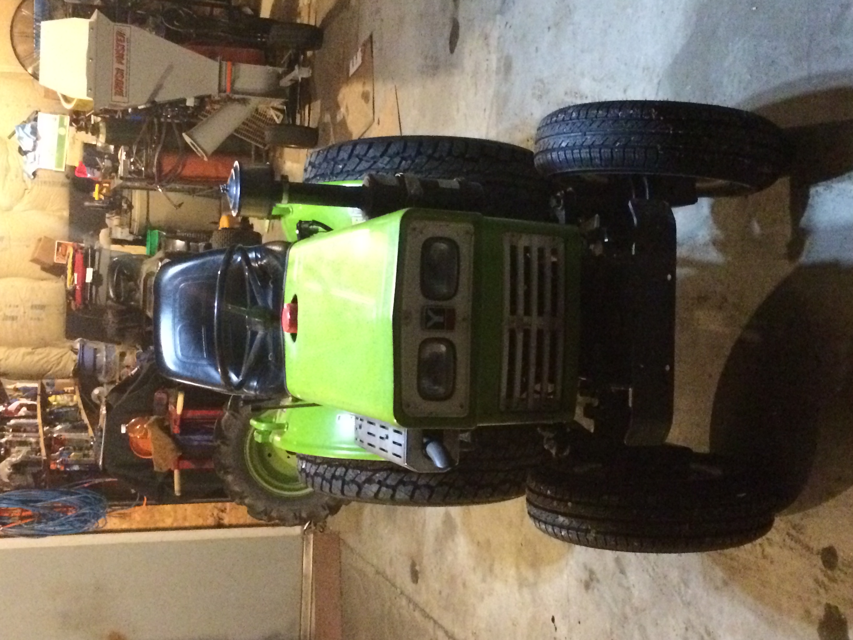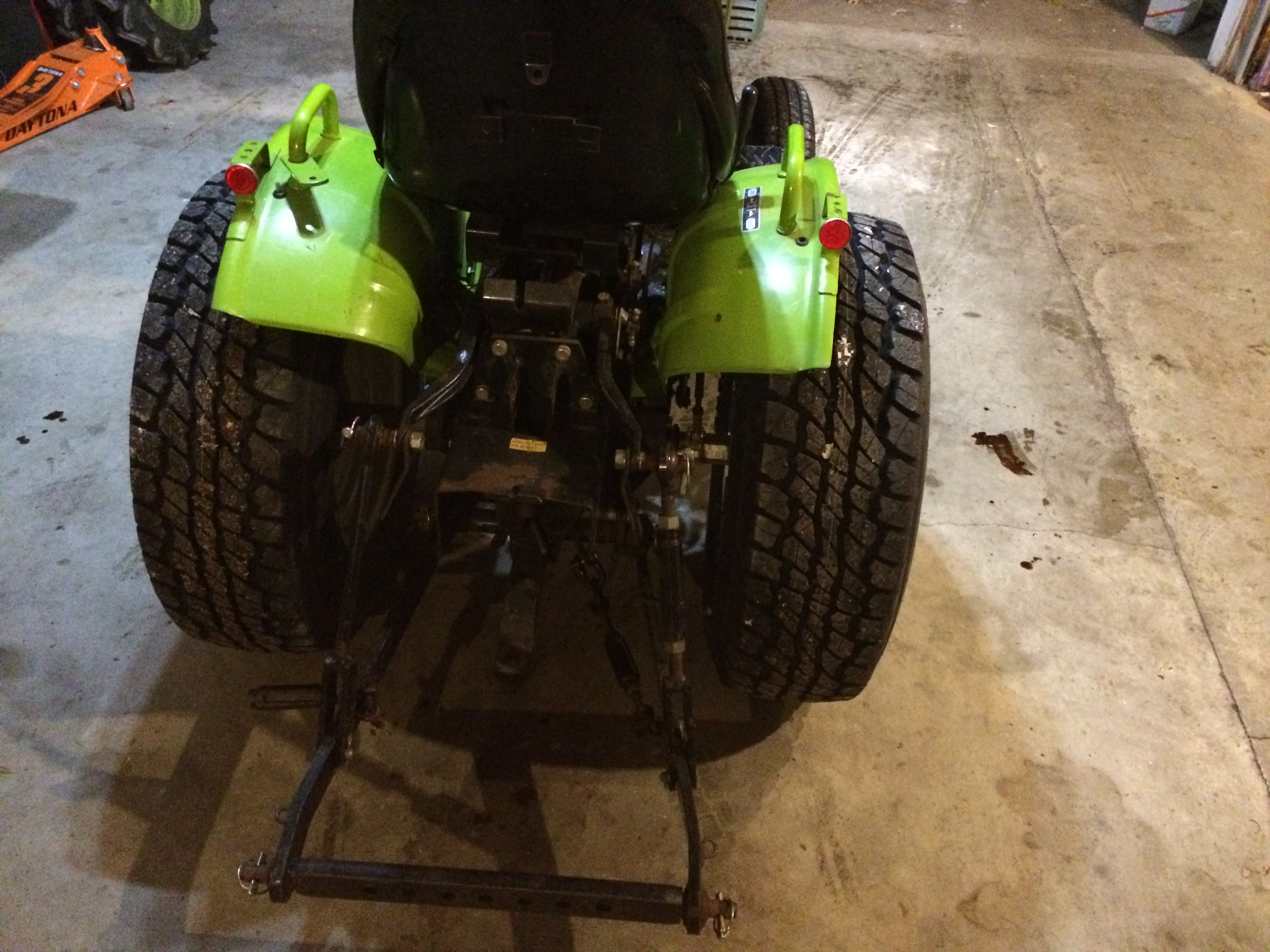 Well I finally pulled the trigger and got different wheels and tires, that way I can keep my R1s and use them when I am in the garden or other food plots. Here are the pics of what I have. Hoye wheels with LT275/75r16 on the rear and 155/80r12 on the front. I also filled all 4 of them with Rimgaurd for extra weight and better pavement traction for this winter when I am using a 3PH snowblower, which I still need to find... The tires are pretty stiff since the back ones are 10 ply, I may take a little air out to give it some more cushion, but since they are LT 10 ply it might not make much difference. I did run it last night in 4wd. I didn't notice anything different with it than how it was before. There is about 2 inch difference in height on the rear from the original R1 tires, and the fronts look to be about the same.