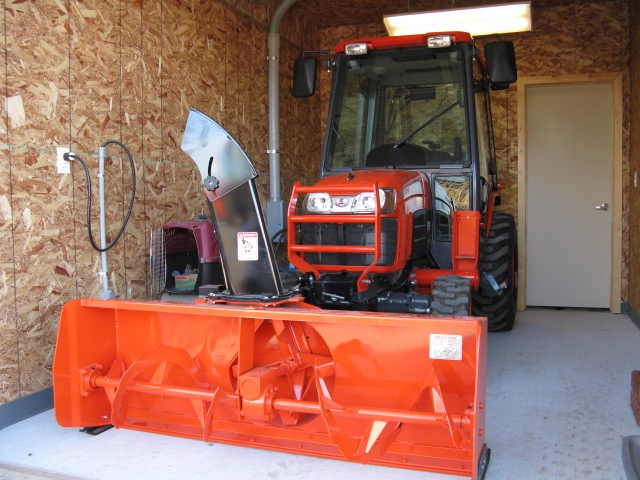 In the barn as long as my wife has not fully sold the idea of turning it into a living room with a view on the ocean. Not too much room for the JD 3520 and his Kubota friend with all their implements. The roof is low over the threshold, you must remember to lower the ROPS and mind your head !