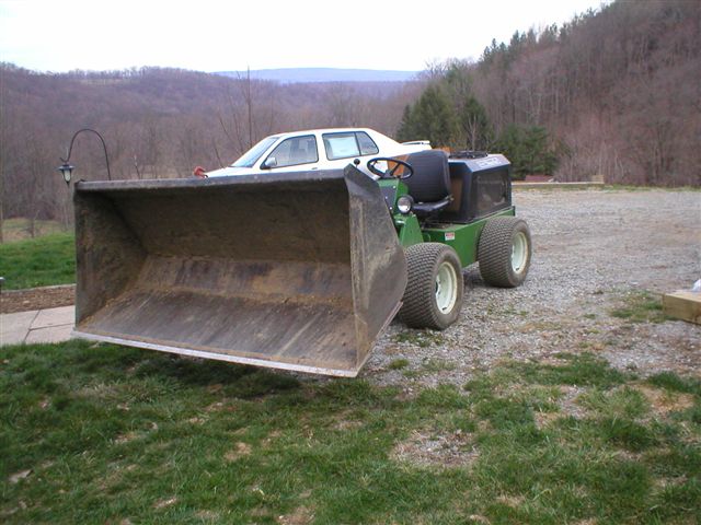 The bucket is off my AGCO ALLIS tractor. I had taken it off one day and had put it away and did not feel like getting it out to move the bucket into my garage and I just happened to have my power-trac out, so I wondered if the power-trac could lift the bucket and carry it over and put it in the garage. I had the power-trac small bucket on and I just put the tip of the bucket under the quick attach plate of the big bucket and curled the pt bucket as far as it would go and then just lifted it up and put it away. The bucket is 6 foot wide and about 3 foot high and 2 foot deep and weighs 180 kg (397 lbs) according to the serial number plate. I was really surprised the pt lifted it without any problem. I thought it would be neat to put a picture of it on the pt forum. And JJ no I did not make the bucket, I have never done any welding and I am not talented like you at making attachments for my pt.