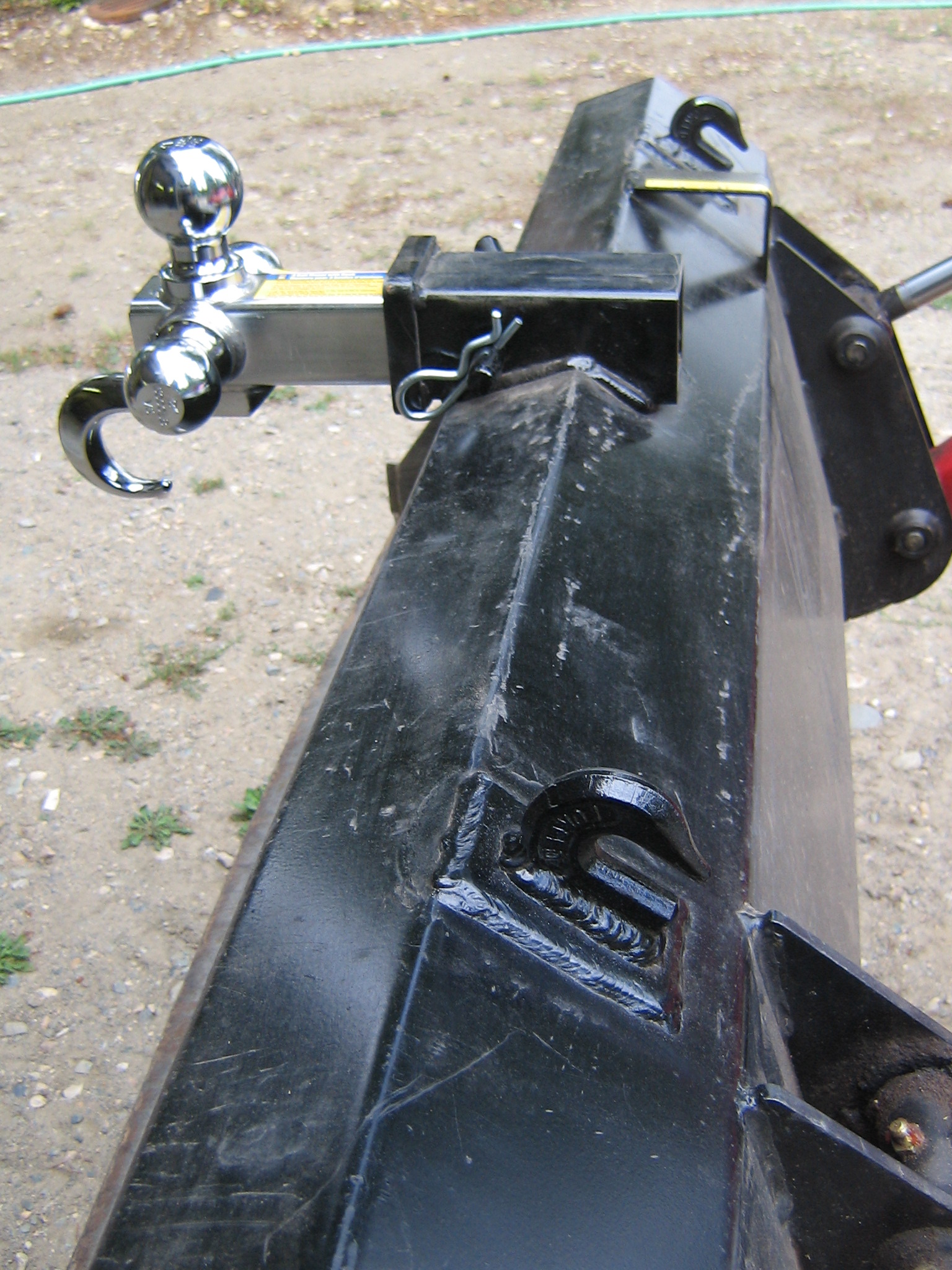 I've added some grab hooks. First I welded on a piece of 3/16" plate, around the perimeter and a large button weld. After cutting some hooks to fit, I welded them to the plate. I also welded in a receiver for a trailer hitch to move trailers around the yard. Unfortunately, this didn't go well as I bent the top of the bucket. It was easy to fix, and then
