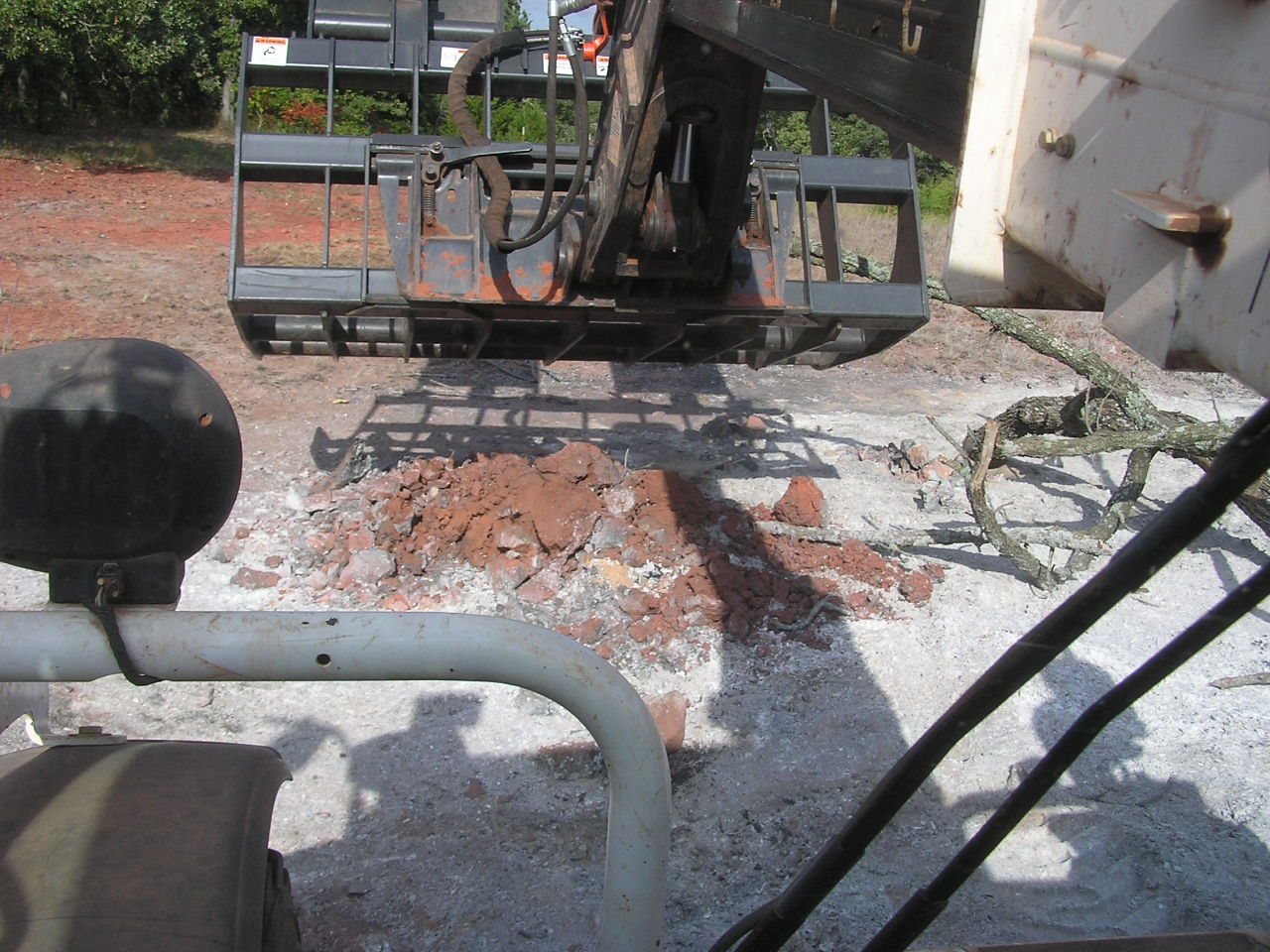 No, I don’t find that the support/spacer tube interferes at all with collecting brush. Brush doesn’t bother a big hunk of steel pushed by a diesel. Loose brush is just pushed along and brush with roots will just be uprooted so you can clamp it. What the tube does do is limit the depth that the tines will easily penetrate soil. That can be a benefit as it isn’t often that you’re going to want to push the grapple forward and dig more than 6-8 inches deep. The tube doesn’t interfere with more focused digging as when digging up a stump.