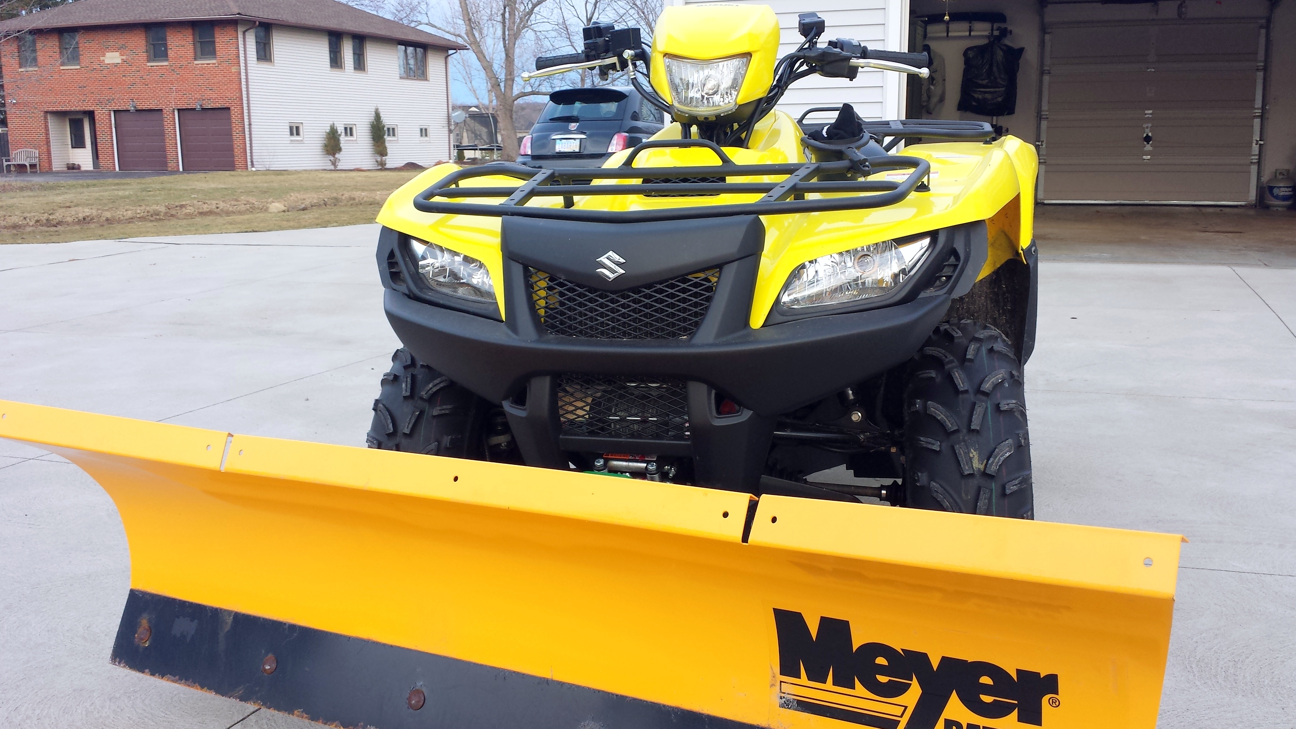 I use Suzuki King Quad 750 and 60" wide Meyer Path Pro plow. It does good job plowing snow on concrete.