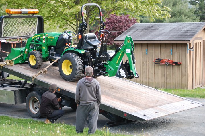 Delivered from the dealer by one of their drivers. It was on a lowboy trailer behind one of their semis. They delivered it to my farm about 60 miles from the dealership on their way to JD in Iowa to pick up some equipment.