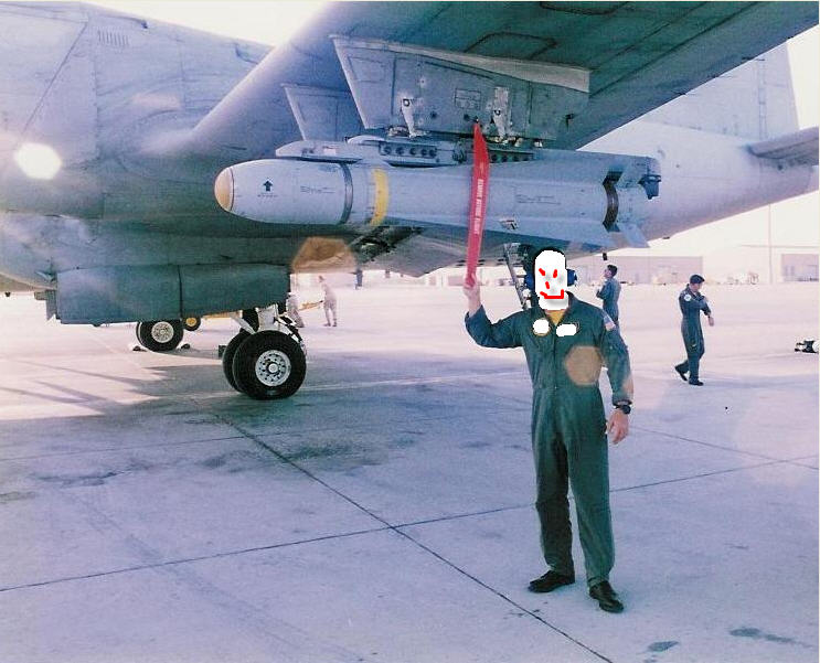 Here's a pic of me (over 10 years ago ;) at an airbase in the middle east). The weapon is an AGM-65 Maverick. Note the single yellow stripe and single brown stripe on the rear. For any kind of security reasons, I photoshopped out my face and squadron patches. :eek: