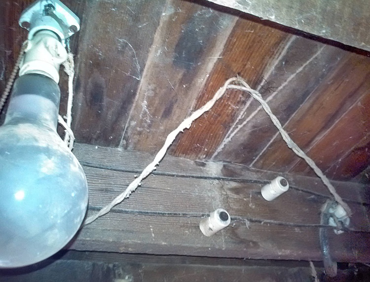 Here's a photo illustrating the worst of the farm wiring I've encountered. I went down in the farmhouse cellar - dirt floor, low ceiling - to see if it is reasonable to string Cat5e to move the principal router to a better place in the house. Looking up at the wiring there ... just plain scary. :eek: The barn and cabin were wired in 1968, 30?? years after this old farmhouse was wired for electricity so their wiring looks cleaner than this but who knows what amateur non-code wiring might be in those outbuildings.