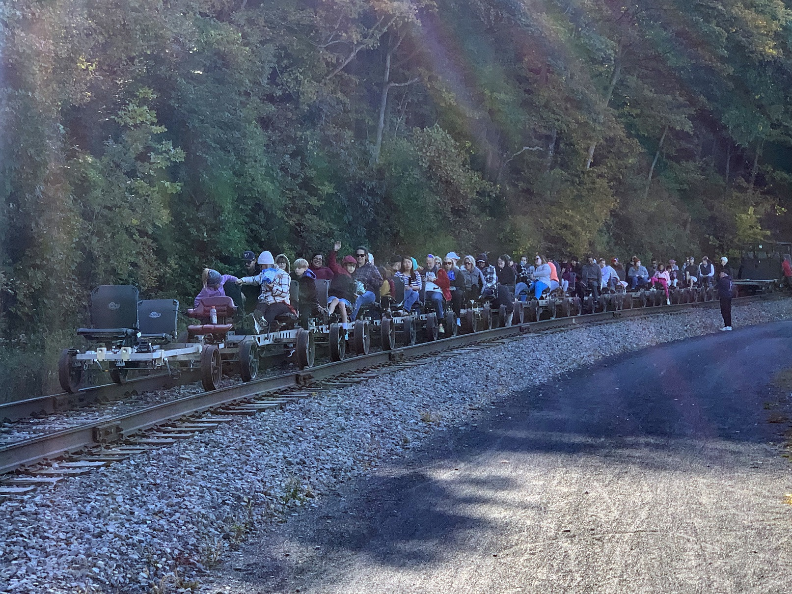 Once at the bottom, the riders get off. All the carts then hook together and the black & red "tender" in pic #1 pulls them back uphill.But what goes downhill has to go up at the bottom...lol Didn't look at the pictures close enough to see any pedals honestly.