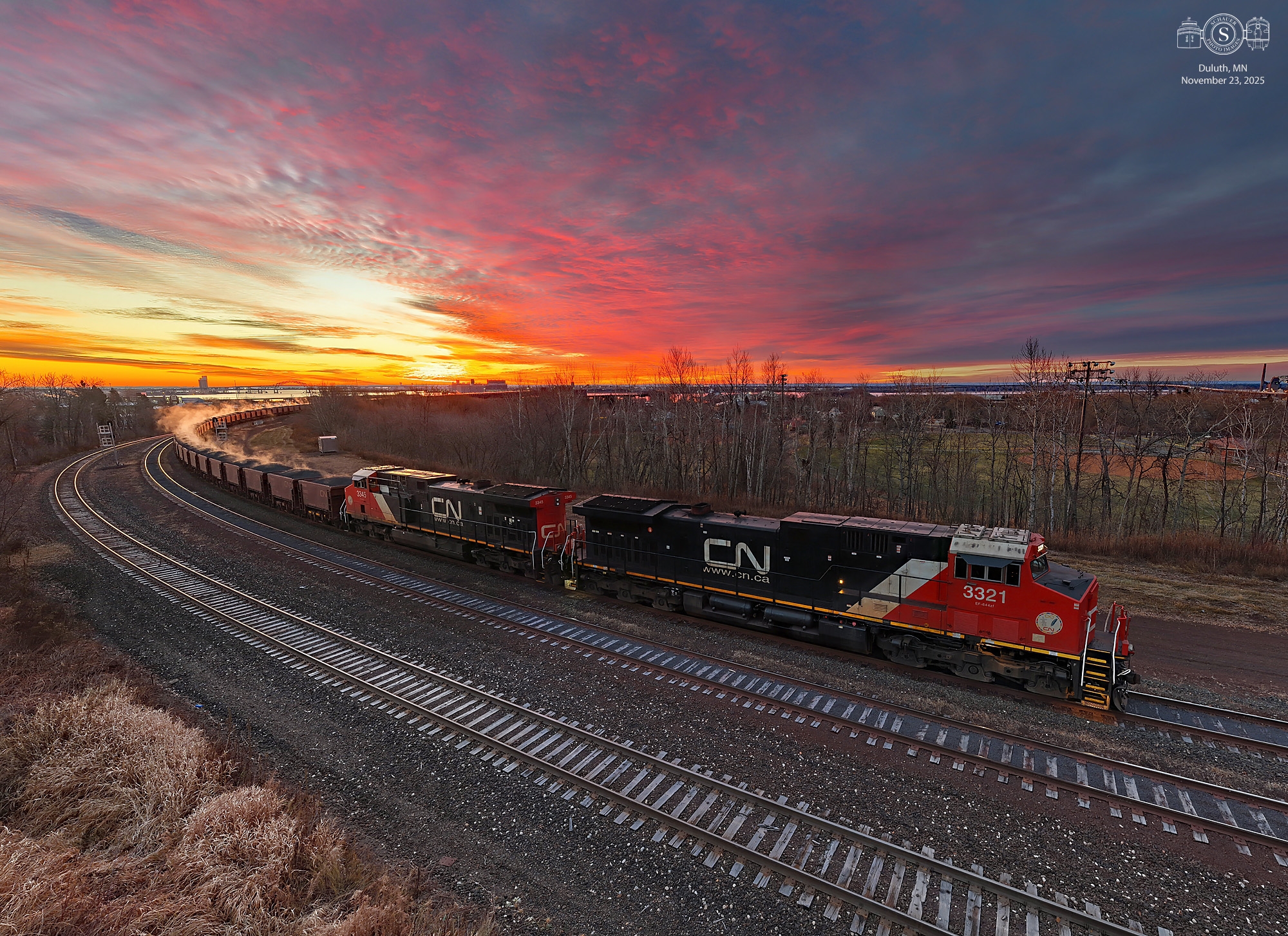 The morning sky on Sunday exploded in color as this ore train was tied down at Collingwood waiting to be dumped later in the day. Duluth, MN - November 23, 2025