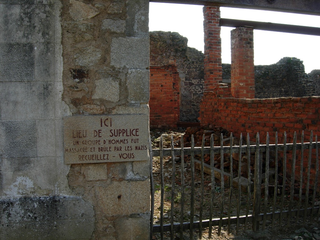 Oradour Sur Glane is a town where on June 10 1944 German solders massacred everyone they could find in the town, killing 642 men women and children then burned the entire town to the ground with all the people in it. It has been left in the condition it was found after the massacre so that people will never forget. It is now a memorial to those who were murdered there.