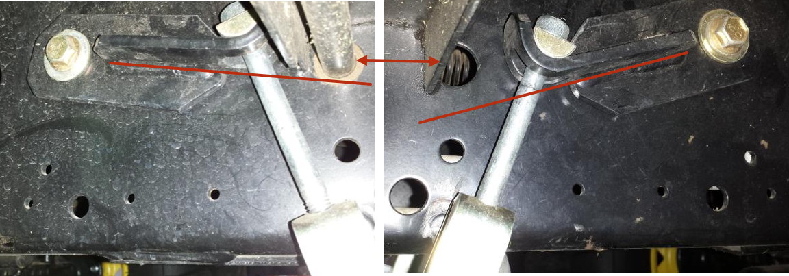 I bought a X758 mower in October of last year. Excellent tractor but the 54" deck would not level properly. When I wanted a 2.5" height I had to put the dial on 3.5" and then the adjustments were way off. One side was adjusted all the way down and the other all the way up. I notified the dealer and he immediately came and saw what I was talking about. They took the machine back and "fixed" it and returned it but it still wasn't right. Instead of boring you I will say that it was back and forth 5 times for the same problem. Finally, with the help from this forum, I found the answer. I wish I could find the post that lead me in the right direction to thank the poster. It seems that the hangers underneath were not even. One was 1" lower than the other. They should be relatively even. I took two pictures, one of each side and attached the post that I had found herre. The dealer replaced the whole assembly which includes the rockshaft. It has since been returned and much to my satisfaction it is all right in the world. I am reposting this because if two of us had this problem there may be more of you out there.