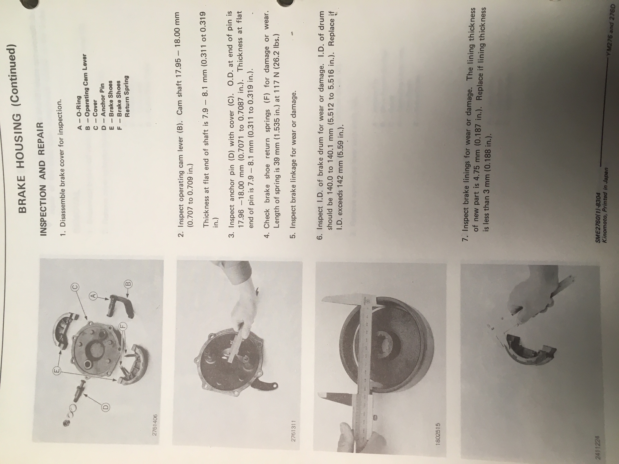 If you have a problem with the drum pitting or finding good shoes, find out who is doing vintage car and motorcycle brake system work in your area. The shop may be British oriented, or older US. He/she will want your old pads and drum. It is possible to fit riveted pads onto the existing shoes by grinding off the remnants of the old bonded pads and then drilling the aluminum shoes for rivets. Much easier than making new shoes. There are tricks for pitted drums as well. ANYTHING IS FIXABLE. Usually the actuating cam is OK, but sometimes the bore it fits into in the drum cover is wallowed out., Check that, more on that below