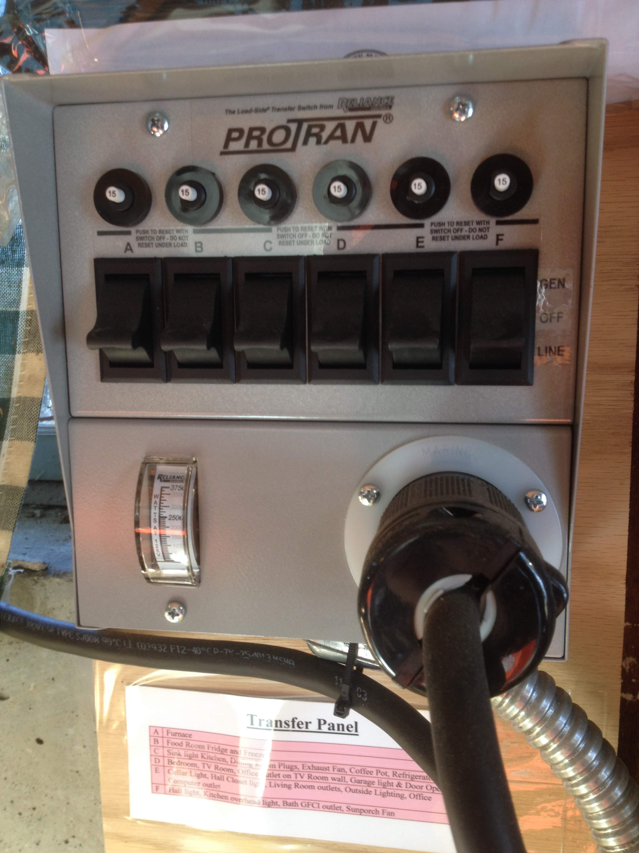 I am opening the main breaker to simulate the failure of the power grid. Once she gets everything running, she just flips the transfer switch box's six switches from Line to Gen, and each power up. In the case of a 'real' power failure, I would not touch the main breaker panel. I would switch the six over to generator. When the power comes back on, certain lights on non-generator enabled circuits will turn on, letting me now to switch back to Line in the transfer panel, and then power down the generators. Quite a seamless and easy way to switch in/out the generators.