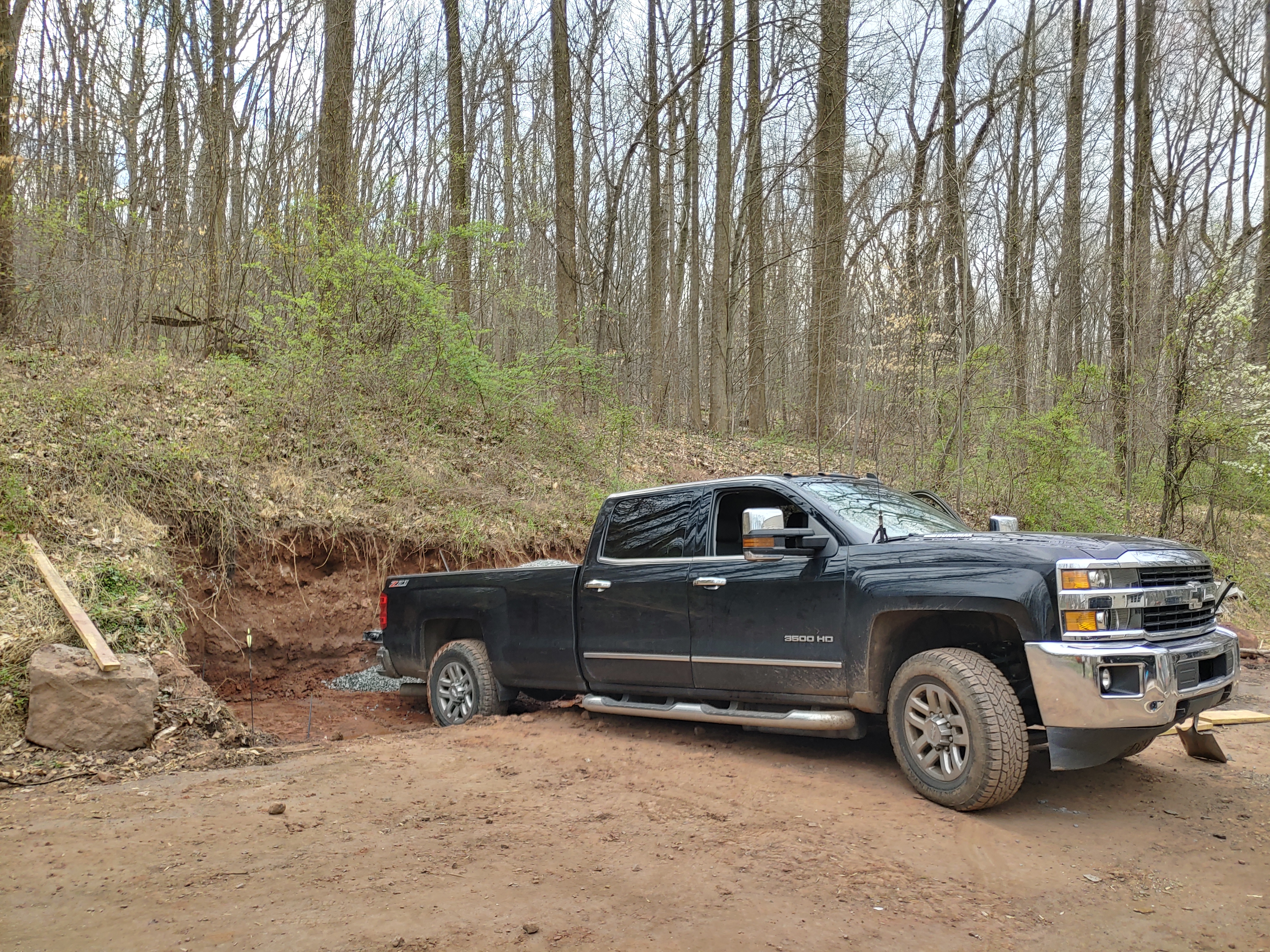 My trailer is too uninteresting to post, as it's just a single axle 5.5ï¾—10 landscape trailer, but I do like my truck. In 2015, I bought a brand new middle-of-the-road Silverado 1500, first time I ever bought a new vehicle after owning about 30 used ones. I had it for exactly one year, before I couldn't take it anymore and traded it in for a fancy 2016 3500 HD LTZ/Z71 Duramax. Every time I needed to haul something heavy, I regretted my 1500 (especially since I'd come off of an 04 2500), so I stepped back up. In this picture, I'm about to unload 2 tons of 2B stone into an area where I need to pour some concrete.